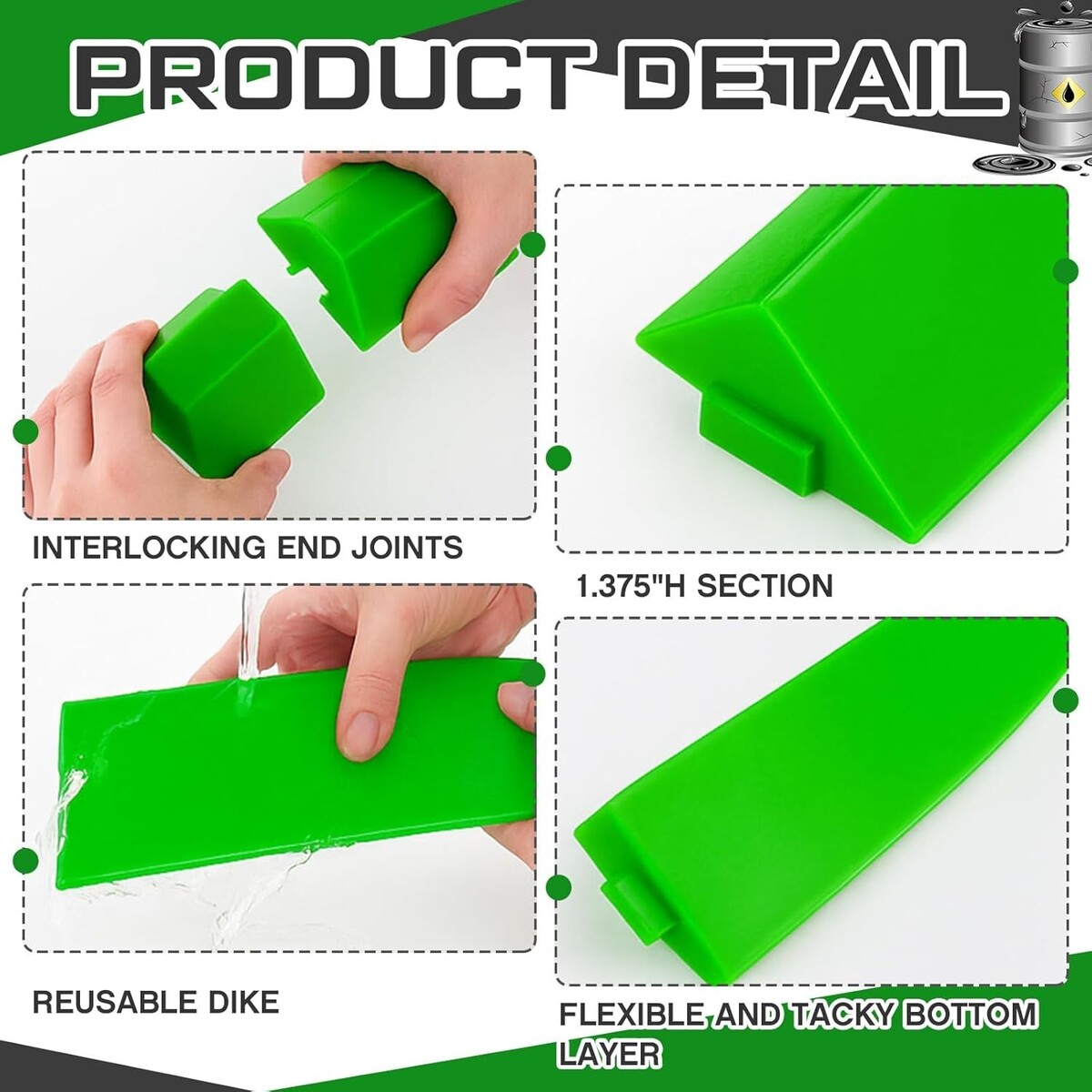 Exceptional Spill Protection: this spill barrier dike provides instantaneous protection against spills, thanks to its sticky surface; Designed to effectively contain unexpected liquid mishaps, this barrier promotes cleanliness and safety protocols, ensuring a tidy environment