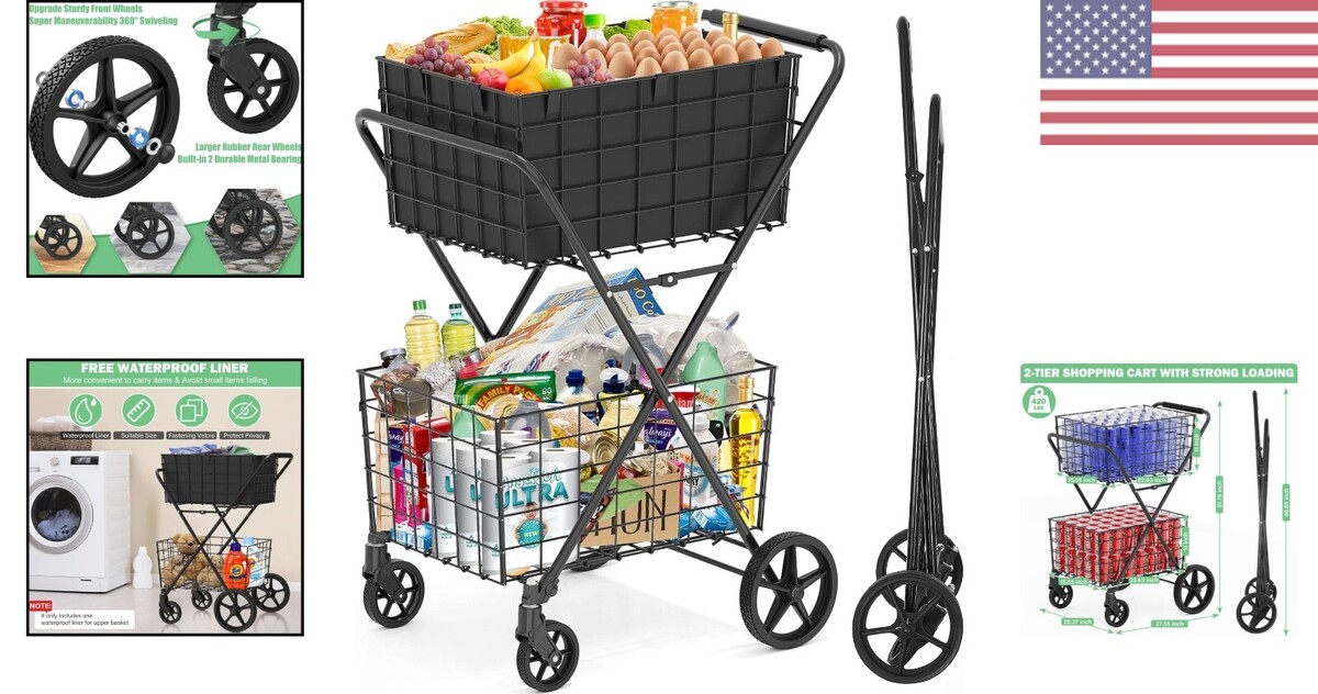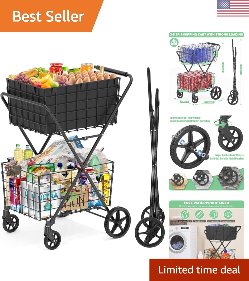 Extra-Large 2-Tier Folding Grocery Cart with Swivel Wheels and Waterproof Liner