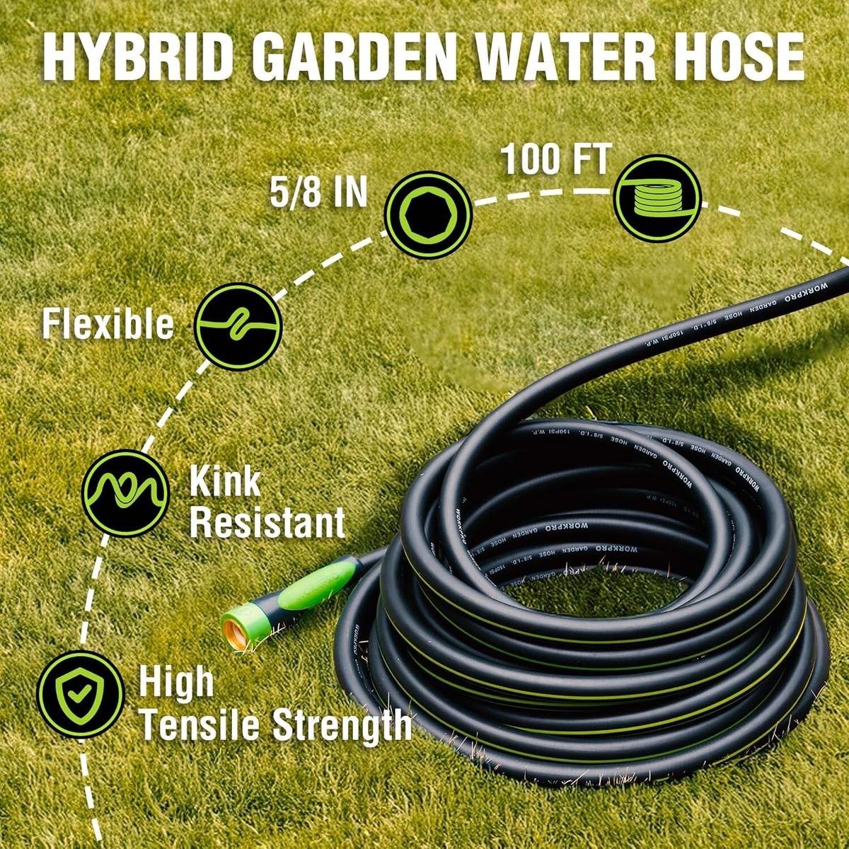 Kink-Free 5/8" x 100ft Hybrid Water Hose with Brass Fittings