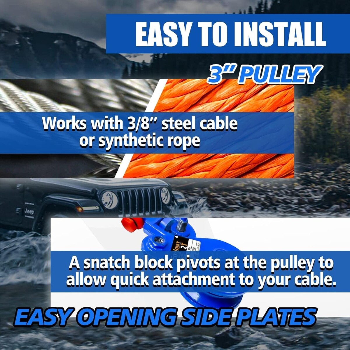 ??SPECIFICATIONS?-- 3" pulley is suitable for 3/8" wire rope, better compatibility. Working load limit 2 Tons(4400lbs). Simple device that makes it easier to lift or pull a heavy load with less force.