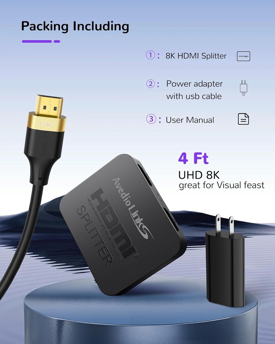 Packing contains: 1 * 4K@120Hz HDMI splitter 1 in 2 out; 1 * Power cable; 1* Power adapter; 1* 4 ft 8K HDMI cable; 1* User manual; Includes all the accessories you need, enhancing your entertainment or work experience with seamless dual displays.