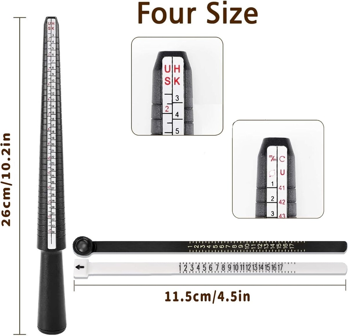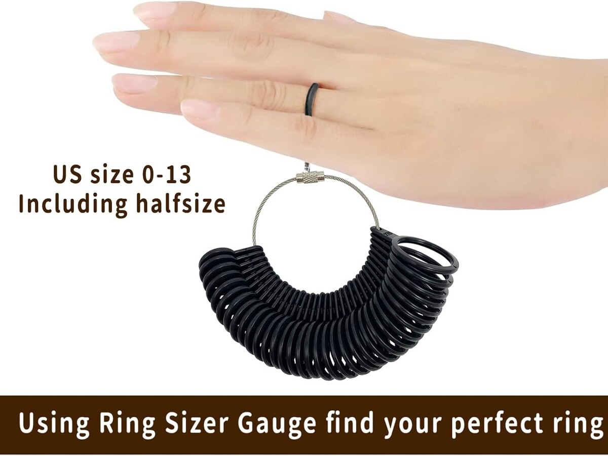 Complete 7-Piece Sizing Kit for Precision:Includes 1 adjustable sizing rod, 2 color-coded sizing rings (28 sizes each in black + white), 3 flexible finger tapes (US 1-17), and 1 paper sizer card. Perfect for accurately measuring ring sizes at home or professionally.