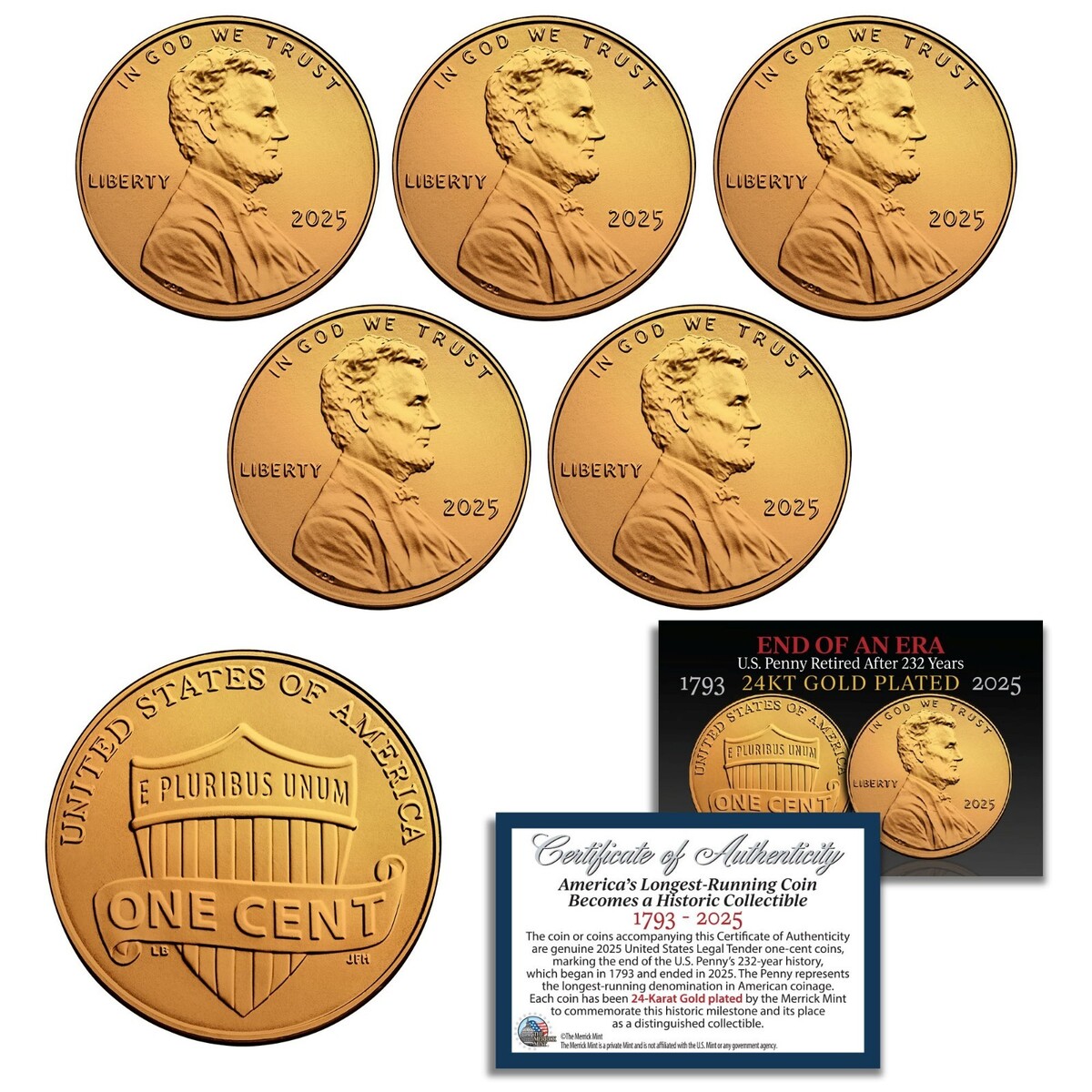 2025 US Penny Cent Uncirculated w/COA - 24K Gold Plated - Last Issue - QTY: 5 *