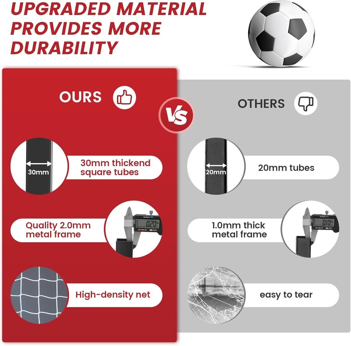 HIGH DENSITY ANTI-TEAR MESH : The soccer nets for kids ages 12-14 is constructed with a knotted polyethylene tear-resistant netting, making it highly durable of enduring powerful shots. Our backyard soccer goals are built with rectangular net shapes to simulate a genuine soccer game feel.The portable soccer goal 12x6ft helps develop shot and goal-keeping techniques, allowing players to improve ball control, agility, and reflexes. Improve your strike accuracy and soccer striking techniques