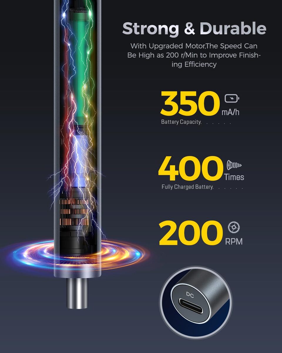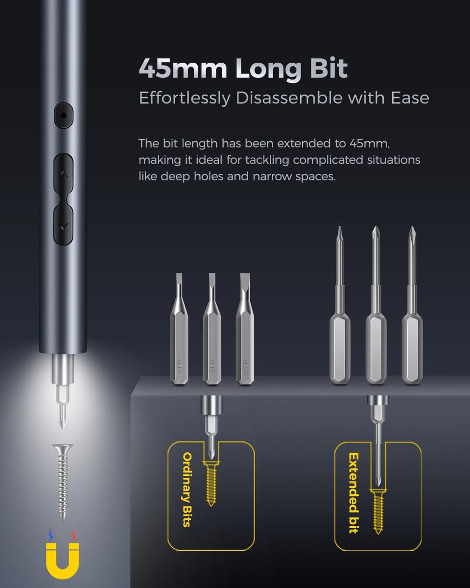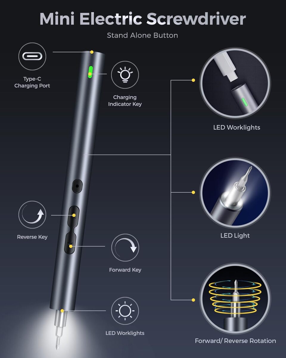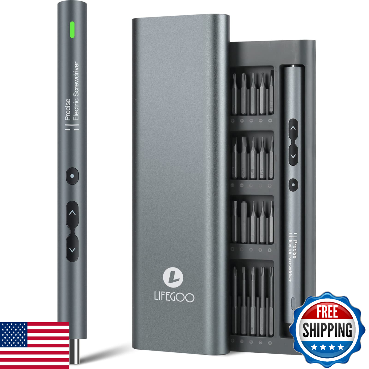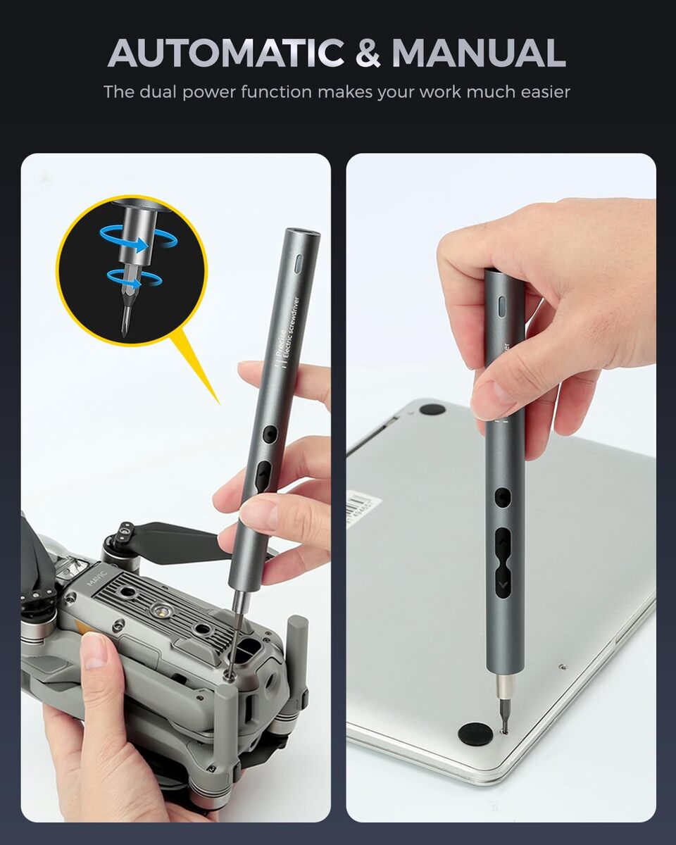 ? Perfect Gift for Every Occasion ?Our LIFEGOO 62 in 1 precision screwdriver kit, designed with a sleek aluminum alloy exterior, not only provides a modern look but also offers a comfortable, matte finish. The pen-shaped body is ergonomically designed for an easy grip, ensuring you handle repairs with ease and precision. Whether it's Christmas, a Birthday, an Anniversary, or Thanksgiving, this product makes for an exceptional gift! Thoughtfully designed to meet all your loved one's needs.,?Small but Powerful?This mini electric screwdriver features an impressive 200r/min rotational speed, providing both automatic and manual modes with torque levels of 0.25-0.35/3N.m. Powered by a 350mAh rechargeable lithium battery, it charges fully in just 30 to 40 minutes and works continuously for up to 2-3 hours?enough power to handle all your electronic repair needs without interruptions.,?LED Light USB Charging?Equipped with a 360-degree shadowless lighting system, this electric precision screwdriver comes with 3 built-in LED lights, ensuring the working area is always illuminated. Its wireless, rechargeable design makes it highly convenient for any project. The 350mAh battery reaches a full charge in just 50 minutes, and the indicator light will always show you the charging status, ensuring you're never left in the dark.,?Widely Applicable?This mini electric precision screwdriver is ideal for repairing a wide variety of devices, including phones, MacBooks, iPads, watches, cameras, laptops, and game consoles. It?s perfect for everything from eyeglasses to PC repairs, making it an excellent gift for friends and family who love tech or need reliable tools for their everyday tasks.,?What's in the box? Our screwdriver set kit includes: 1 precision screwdriver, 48 magnetic precision bits, 1 magnetic mat, 1 magnetizer demagnetizer, 2 thick and 2 thin triangles, 1 suction cup card picker, 1 metal crowbar, 1 15cm nylon long crowbar, 1 stainless steel tweezer, 1 USB charging cable, and a handy storage case. It also comes with a detailed user manual to guide you through each step.
