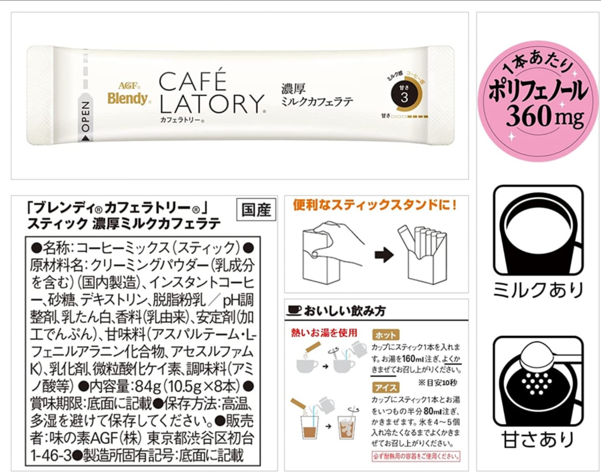 Ingredients: Creaming powder (contains milk components) (manufactured in Japan), instant coffee, sugar, dextrin, powdered skim milk/pH adjuster, milk protein, flavoring (derived from milk), stabilizer (modified starch), sweetener (aspartame L) -Phenylalanine compound, acesulfame K), emulsifier, fine silicon oxide, seasoning (amino acids, etc.).