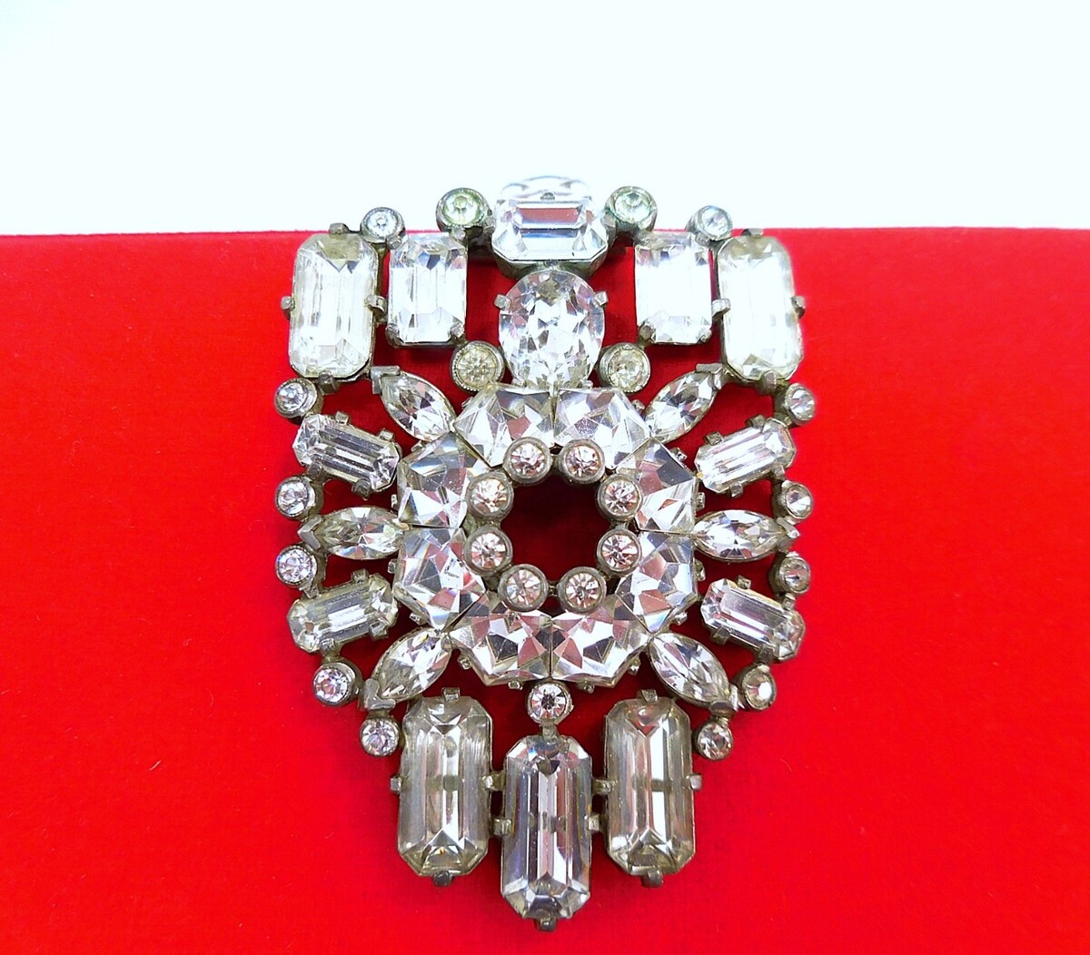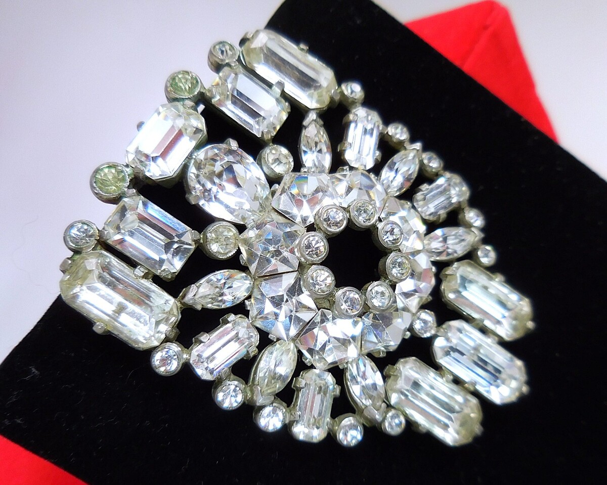 Beautiful vintage Eisenberg Originals dress/fur clip from the early?mid 1940s. Features a bold starburst design with sparkling clear rhinestones, including rare star?shaped stones used only in select Eisenberg pieces. Large, it measures about 3" x 2". Notice the center is tiered.