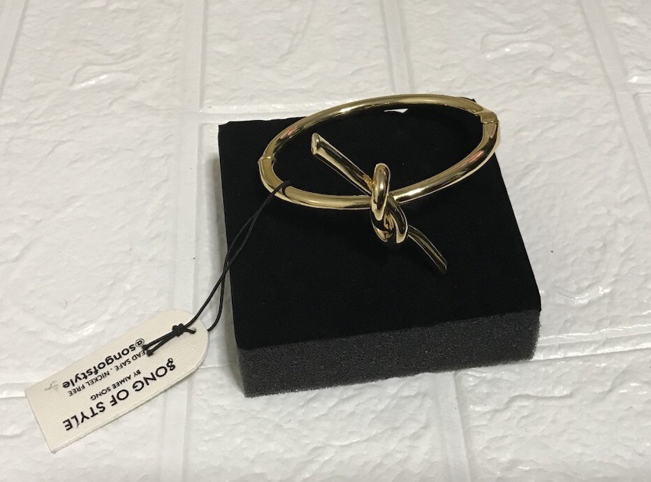 The knot gold bracelet by Song Of Style features a stylish knot design in a luxurious gold color. Made with stainless steel, this bangle bracelet has a secure magnetic closure for easy wearing. Perfect for adding a touch of elegance to any outfit, this fashionable jewelry piece is a versatile and chic accessory for your everyday style.