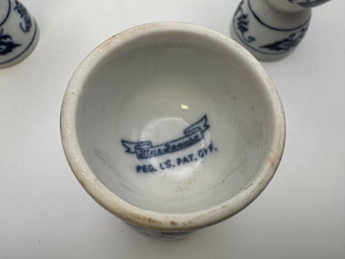 These egg cups measure 3 3/4" in length. They measure 2 1/2" in diameter on the large end and 1 7/8" in diameter on the small end. They are in very good condition with no chips, cracks, or excessive wear.