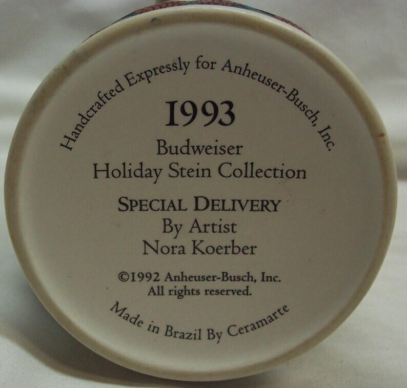 This is a VINTAGE Anheuser-Busch Clydesdale Horses Christmas Holiday CERAMIC BEER STEIN MUG from 1993. It is in great condition. It is CLEAN! No Chips, Cracks or defects. It measures 6 3/4 inches tall. Made in Brazil. Combine auctions to save on shipping. EAG