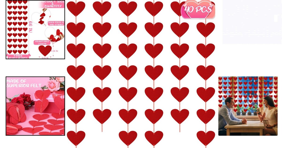 Elevate your Valentine's Day celebrations with our Charming 40-Piece Heart Banner. Made from the finest felt material, this romantic decoration is designed to delight both young and old. With its pre-strung convenience and adjustable length, it promises a hassle-free setup, allowing you to focus on what truly matters: creating memorable moments with your loved ones.