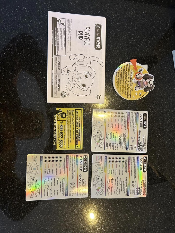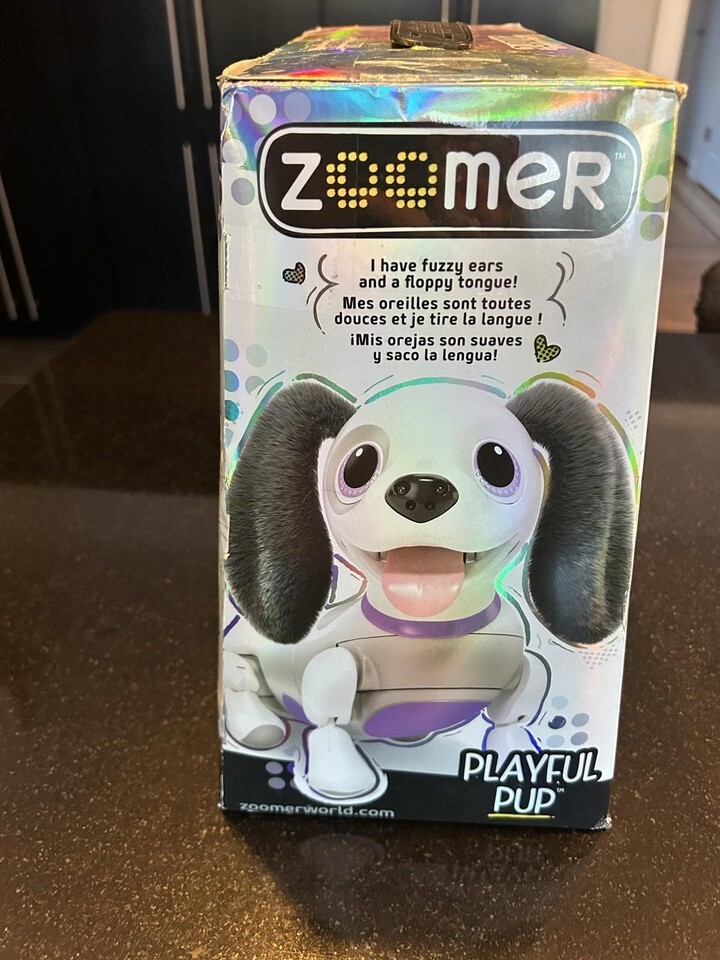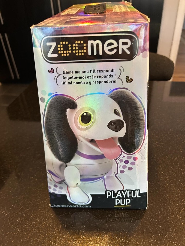 Interactive Zoomer Playful Pup robot dog toy. Responds to name and commands. Can perform over 25 tricks. Suitable for children aged 5 and up. Comes in original packaging with holographic design. A fun and engaging toy for kids that encourages interactive play.
