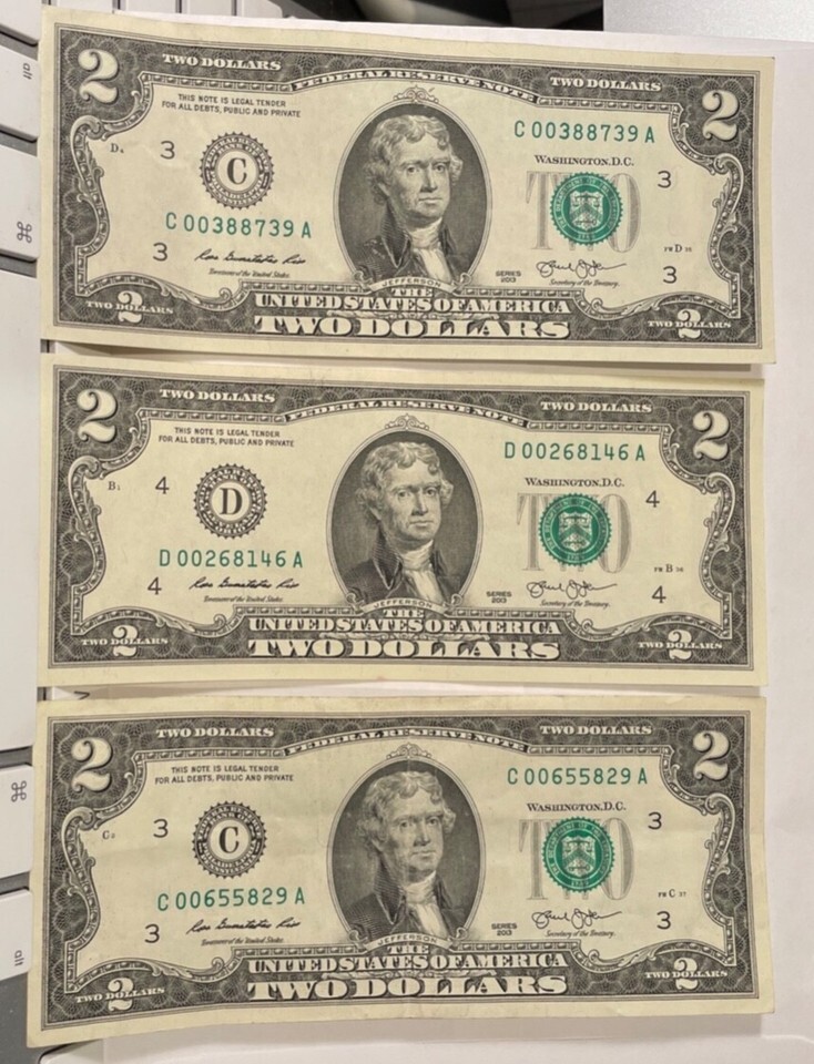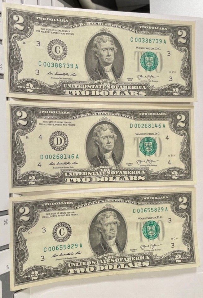 $2 BILLS 2013 CONSECUTIVE LOW SERIAL # D00268146 A + # C00655828 A+ #C 00388739 A -TWO BILLS ARE VERY CRISP AND I WOULD SAY IN MY OPINION ARE UNCIRCULATED, HOWEVER ONE WITH DIGITS 00655 HAS A FOLD BUT STILL CRISP