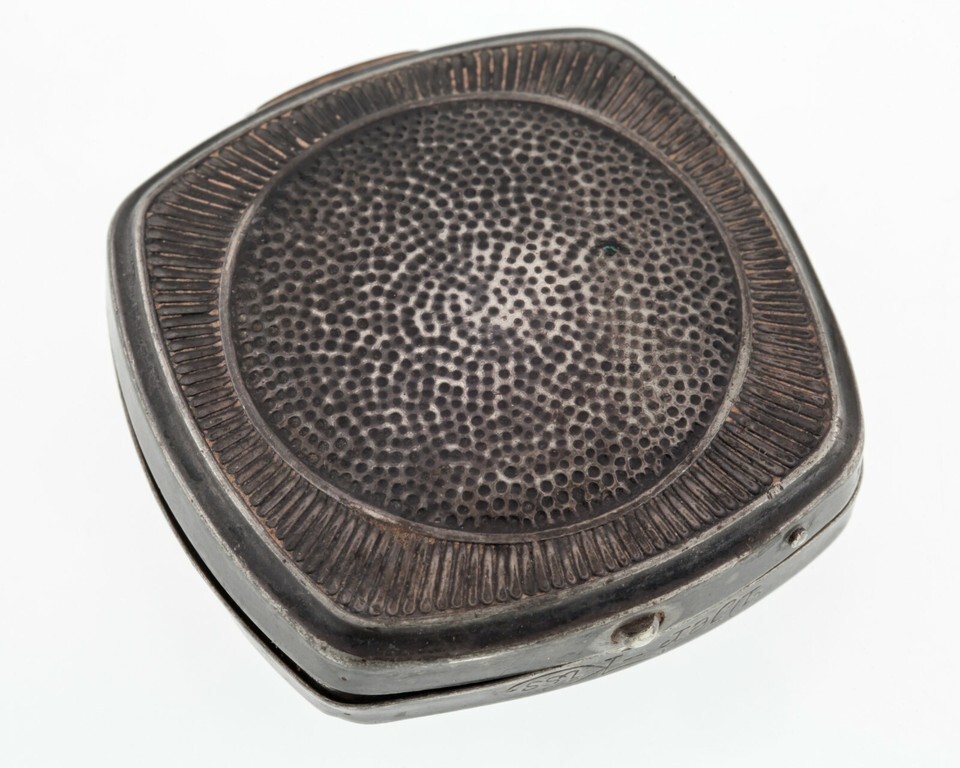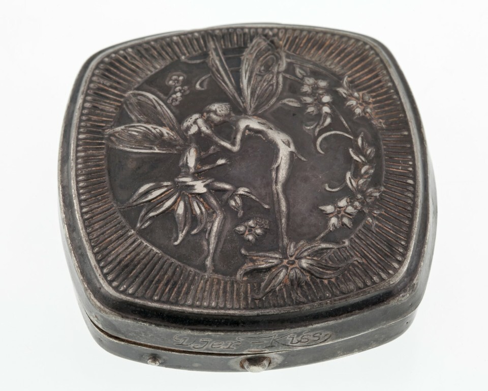 Silver plated cushion shape powder compact case with repose kissing fairies