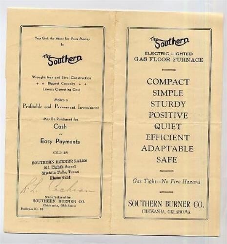 An 8 section fold out brochure on Southern Electric Lighted Gas Floor Furnaces manufactured by Southern Burner of Chickasa, Oklahoma. In very good condition with a sales persons name penciled on the back, a dealers name stamped on the back , has been folded. Circa 1930's.
