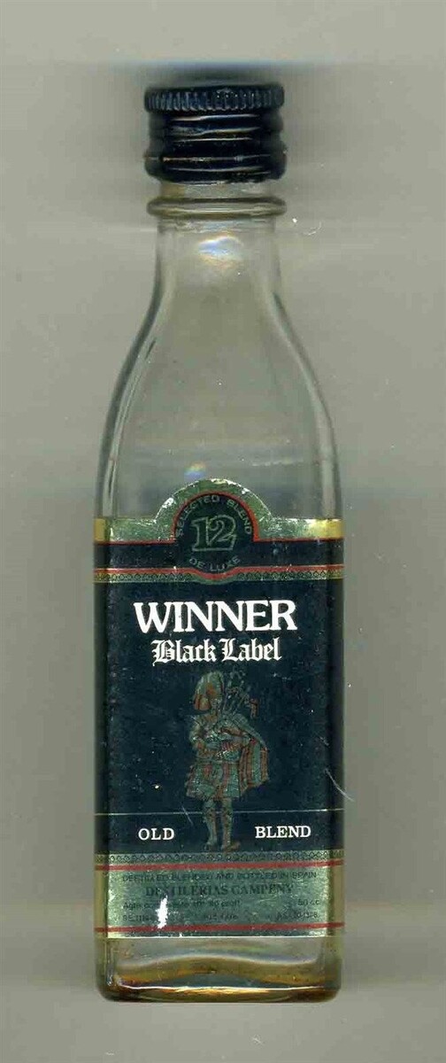 A sealed but empty miniature glass bottle of Winner Black Label Old Blend , distilled, blended and bottled in Spain.. The contents of this bottle have been emptied or have evaporated... Has a Spanish tax stamp on the bottom