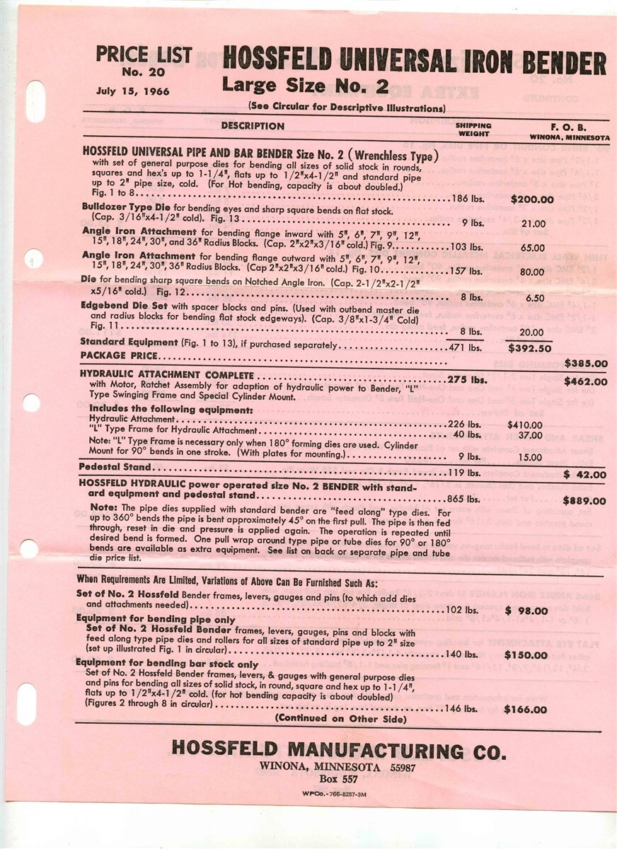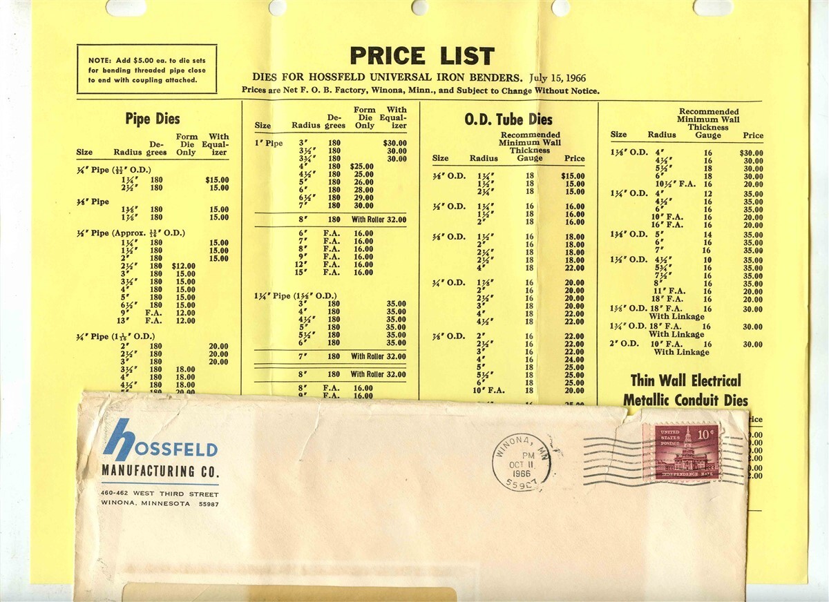 There are 6 items in this lot from the Hossfeld Manufacturing Company of Winona Minnesota. There is a cover letter dated 1966, Includes 6 pages of product information an photos of Universal Iron Bender products, a price list for the Universal Iron Benders and a price list for the Pipe and Tube Dies. A Business Reply card and teh original mailing envelope. The product information sheets and price list have been hole punched to be inserted into a note4book.