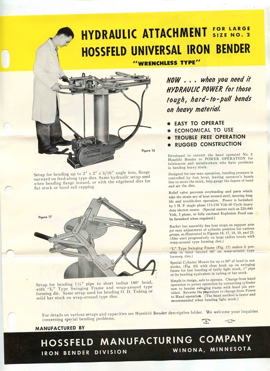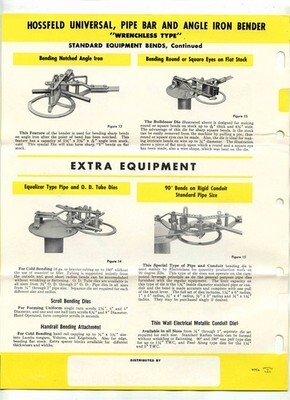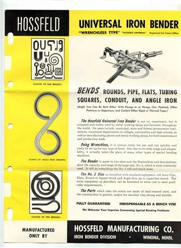 Hossfeld Manufacturing Universal Iron Bender Info Packet 1966 Winona Minnesota