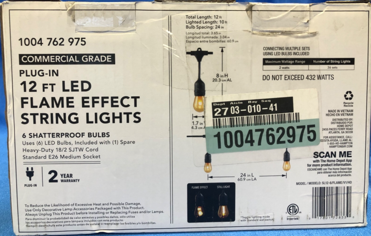 The Hampton Bay 6-Light 12 ft. Indoor/Outdoor Plug-In LED Flame Effect String Light is a versatile and stylish lighting solution for both indoor and outdoor spaces. With a sleek black design and easy wall plug-in power source, this string light creates a warm and inviting ambiance with its LED flame effect bulbs. Perfect for adding a touch of sparkle to your yard, garden, or outdoor living area, this string light from Hampton Bay is sure to enhance the beauty and charm of your space.