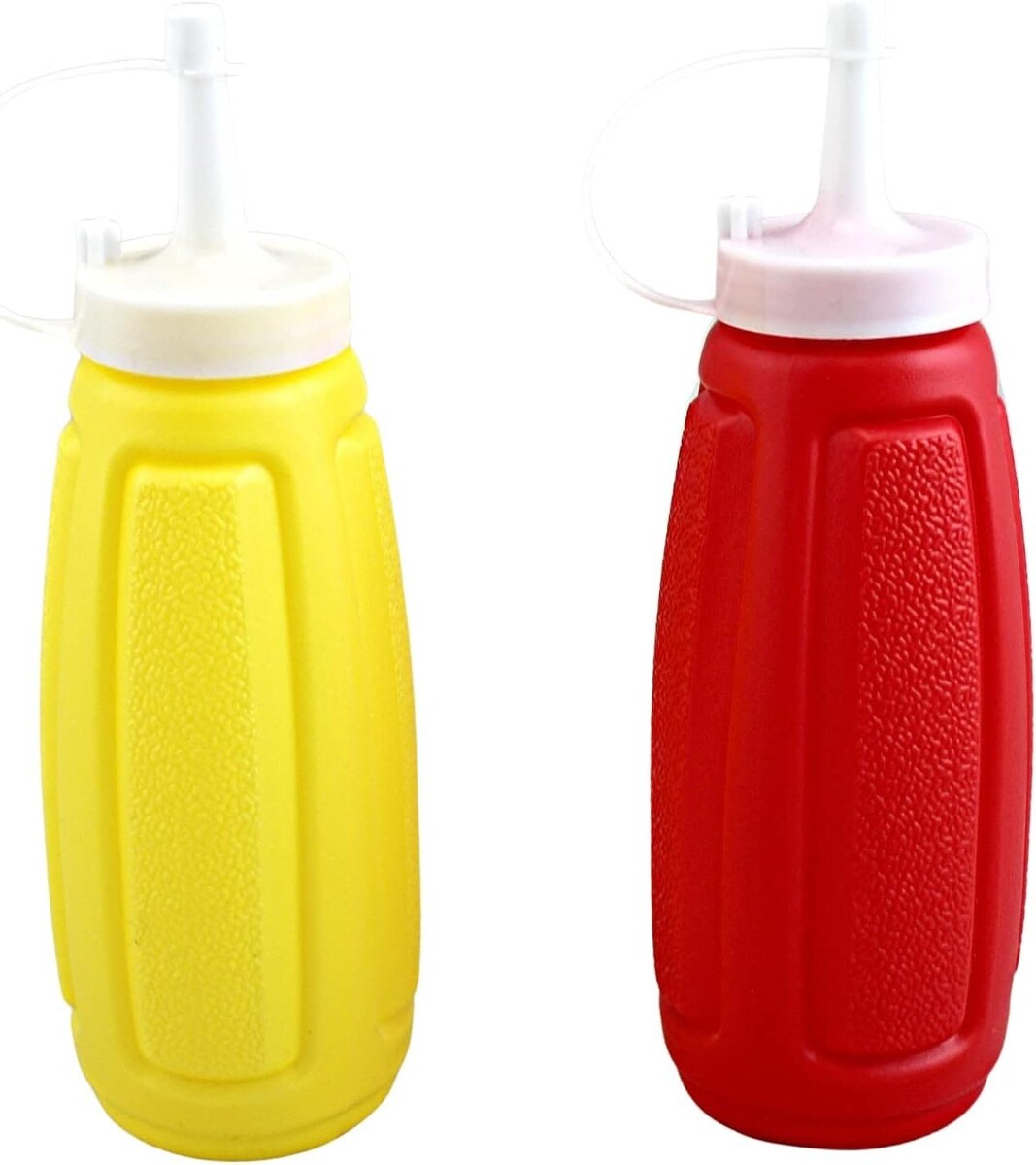 This 4-piece condiment bottle set includes one red bottle and one yellow bottle, designed for ketchup, mustard, and other liquid condiments. Each bottle holds up to 12 ounces and is made from BPA-free plastic for everyday food use.