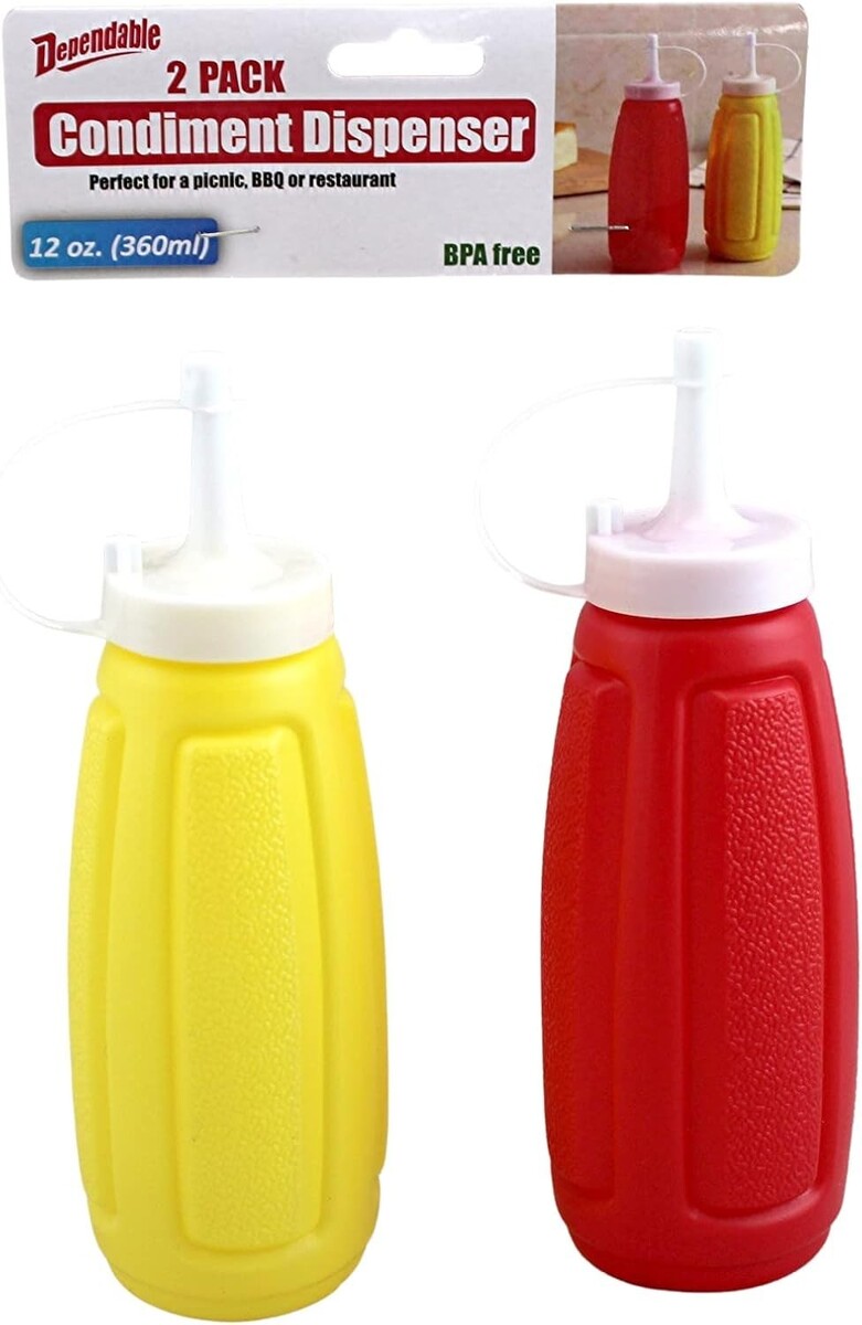 The bottles feature an easy-squeeze design with a screw-on cap and attached top cover to help prevent spills and leaks. Suitable for use with ketchup, mustard, BBQ sauce, mayonnaise, salad dressing, and similar condiments.