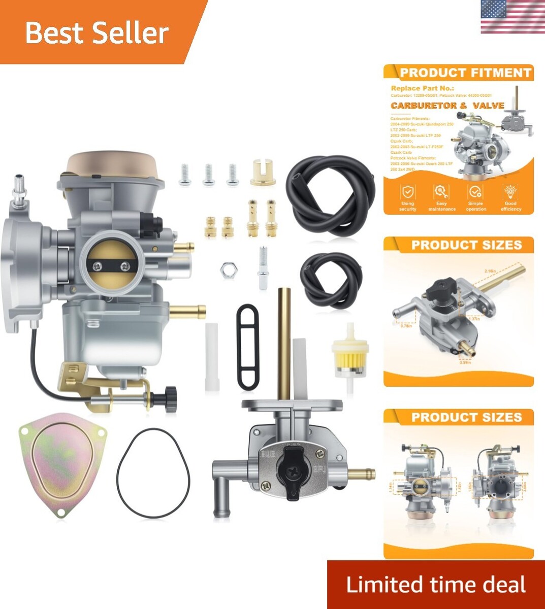 Carburetor + Petcock Fuel Valve for Su-zuki Ozark LTZ 250 Quadsport 250 Carb 2004-2009 LTF 250 2x4 2WD 2002-2009 Shutoff Switch, 13200-05G01
