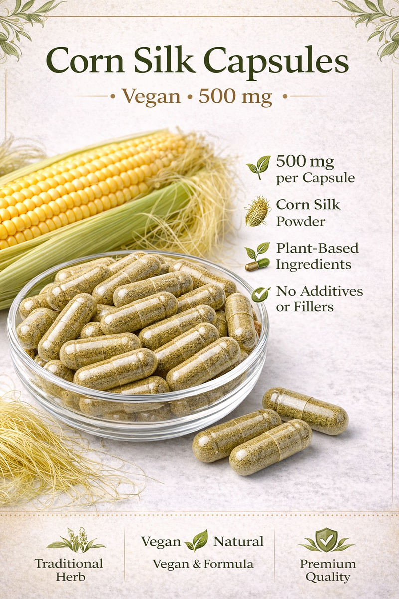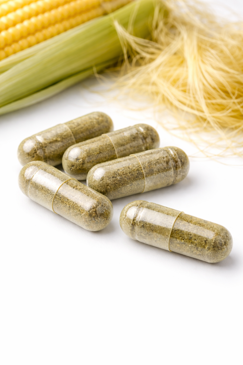 Corn Silk Capsules are made from carefully dried corn silk (Zea mays) and encapsulated in vegan capsules for convenient daily use. A traditional botanical ingredient prepared in a clean, simple form.