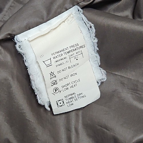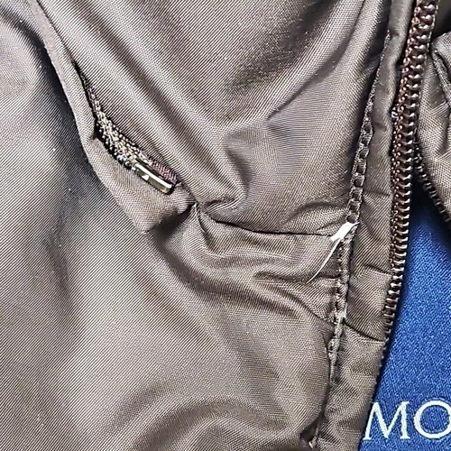 Missing zip-off hood, zipper needs fixing or replacing; I do not have access to OEM parts. Fiber content tag is visibly frayed. Some wear at the tummy and a tiny hole near the tags. The lining within the lining prevents feather loss. Cleaned