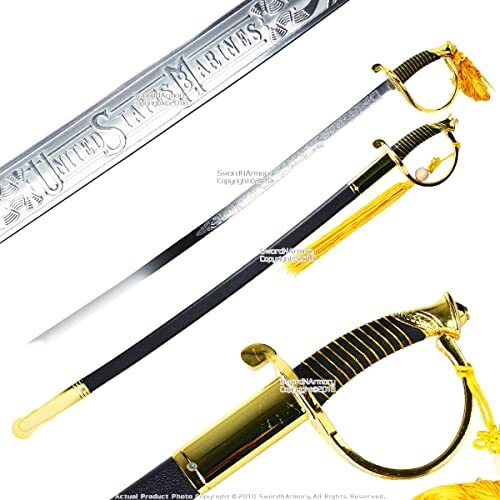 Product description: This is the US NCO Marine Saber Sword. The blade has been constructed from 440 stainless steel with a false edge and detailed scroll work. The guard is a full wrap design with a black leather handle and gold wire. - Blade: The blade has been constructed from 440 stainless steel with a false edge and detailed scroll work. - Handle: The guard is a full wrap design with a black leather handle and gold wire. - Scabbard: The scabbard is constructed from steel with a black leather cover, two suspension rings, belt clip, and a golden tassel. - Overall Length: 34.5 " - Blade Material:440 Stainless Steel - Blade Length:29" - Handle Material: Leather Wrap with Gold Wire Wrap - Handle Length: 5 " - Scabbard Material: Steel with Fake Leather Wrap - Condition:Brand New