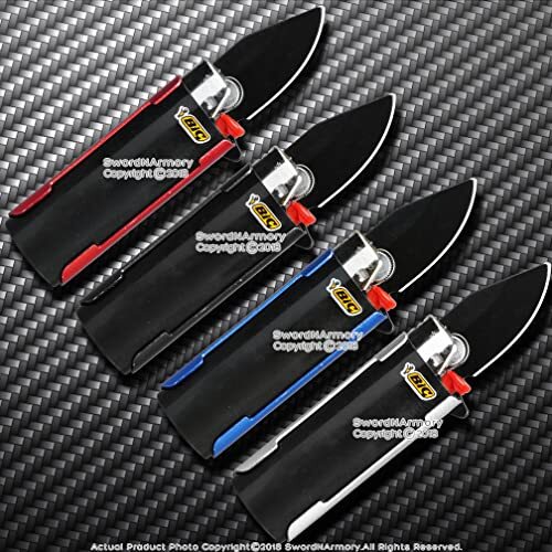 Product description: Night falls quickly on the dusky forest, the shadows of the knotted pines stretching out and merging into each other, as the lone woodsman sets up camp for the night. Instead of taking the time to drill notches into a branch, he simply reaches for his trusty lighter and knife set, cutting off a piece of fire starter, and setting it aflame. This handy tool holds your standard Bic sized lighter as well as acts as a folding knife, all of which clips to your belt. [Dimensions] Overall Length: 4.5? Blade Length: 1.98? Folded Length: 2.5? [Blade] Moderately sharp, spring assisted, and constructed of stainless steel [Handle] Made of Aluminum, and is able to both hold a standard-size lighter and clip to a belt [Colors] Choose one to match your style, from silver to red to blue to black to green [Quality] All of our products are made of the finest materials, and are packaged securely in our own warehouse