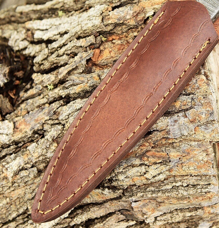 The handle is made of wood and is comfortable to hold. This knife also comes with a sheath included to protect the blade. Whether you're camping, hiking, or just need a reliable knife for everyday tasks, this knife is sure to meet your needs. It is a one-of-a-kind piece that is sure to impress.