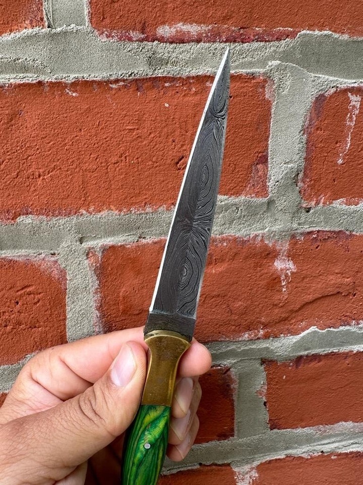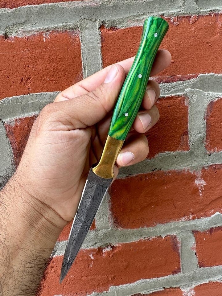 This handmade Damascus steel knife is perfect for hunting, survival, and everyday carry. With a full tang and double-edged blade, it is both durable and versatile. The needle point blade is made of high-quality Damascus steel and has a plain edge, while the gray-colored blade adds a unique touch.
