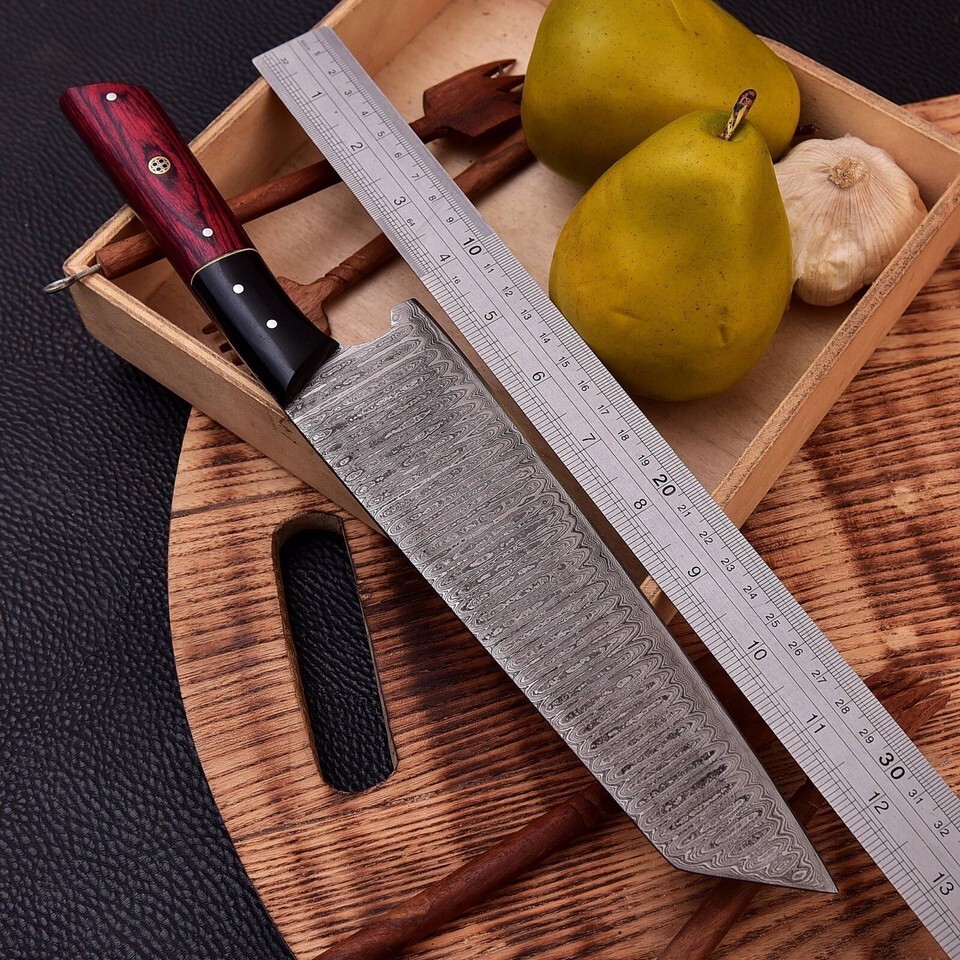 Introducing the 13? Handmade Damascus Chef Knife, a versatile and high-quality addition to your kitchen. This Japanese Bunka kitchen knife is made with care and precision, using wood, cast iron, and carbon steel materials. The blade is straight-edged and 8? in length, perfect for cutting a variety of foods, from vegetables to meat.