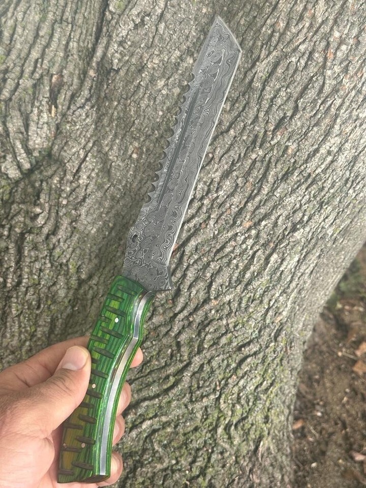 Blade of this knife has a nice file work and is made of 512 layers of 4340 stainless steel and 1075 high carbon steel and hardness 55-58 HRC .