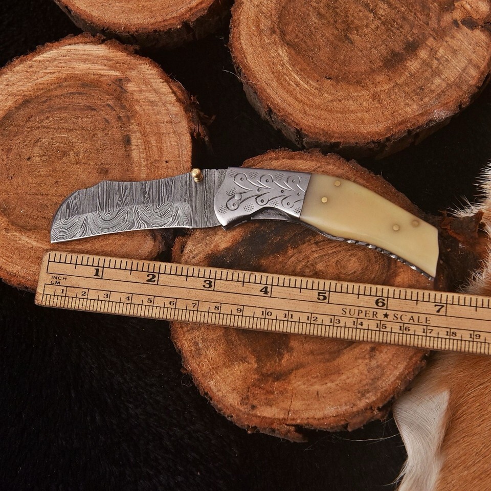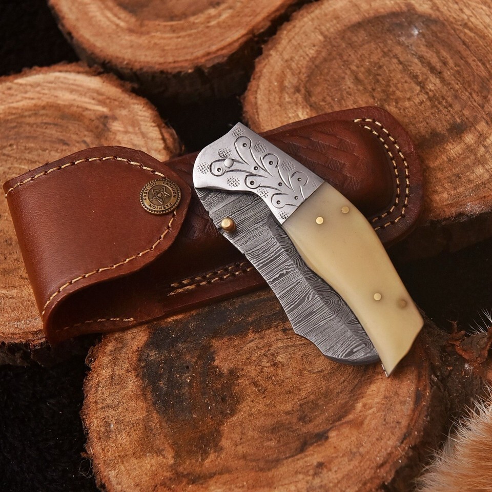 Damascus Folding Tanto Blade Pocket Knife Skinning Tactical Camel Bone Handle