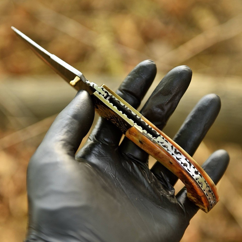 Handmade Damascus Folding Blade Pocket Knife Tactical Ram Horn Handle Hunting