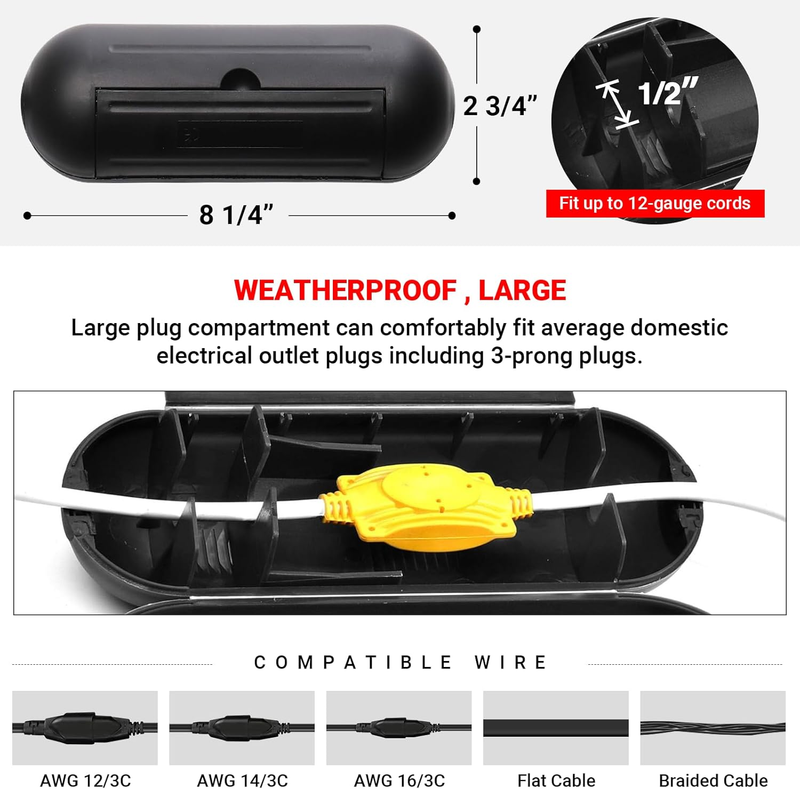 PROTECTIVE COVER CAN FIT UP TO 12 GAUGE CORDS - The protector encasement has a length of 8.25 inches and a diameter of 2.75 inches. The wire entry points can accommodate up to 12-gauge cords while the large plug compartment can comfortably fit average domestic electrical outlet plugs including 3-prong plugs. The opening is only 0.4-inch, ensuring that the fit will be tight no matter the size of the cord.