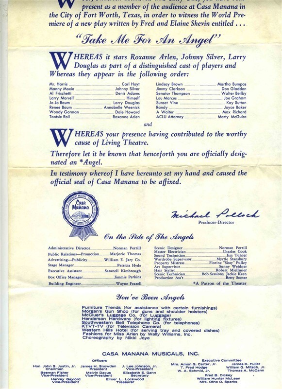 A large single page Proclamation. Given to members of the Audience at the November 11, 1961 World Premiere of Take Me For An Angel at the Casa Manana Theatre in Fort Worth Texas. Starring Roxanne Arlen, Johnny Silver and Larry Douglas. Measure about 8 1/2" x 14" and the back is blank. A new play by Fred and Elaine Shevin