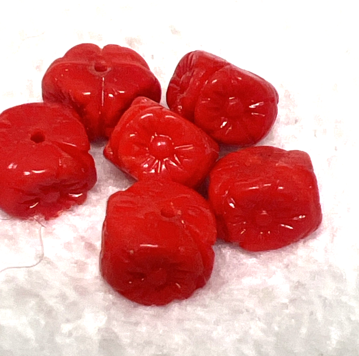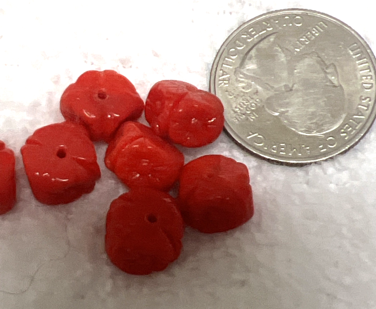 7 Vintage Art Glass Beads Red Flat Cut Square Flower Faces 3/8 x 1/4