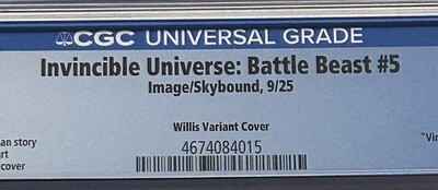 The product is a highly collectible BATTLE BEAST #5 comic book, featuring a limited edition Willis NYCC Virgin Foil Variant cover numbered 241 out of 400. This CGC 9.9 Mint graded comic from the Invincible universe, published by Image Comics in 2025, is a must-have for fans of action and adventure comics. With the signature of Robert Kirkman, the cover artist, this colorful single issue is a valuable addition to any comic book collection, especially for those who appreciate modern age comics.