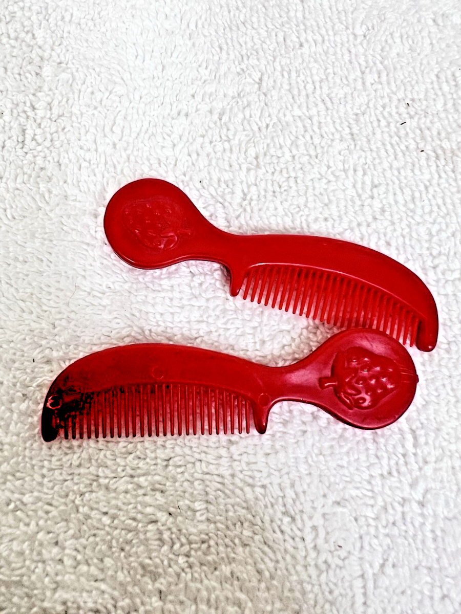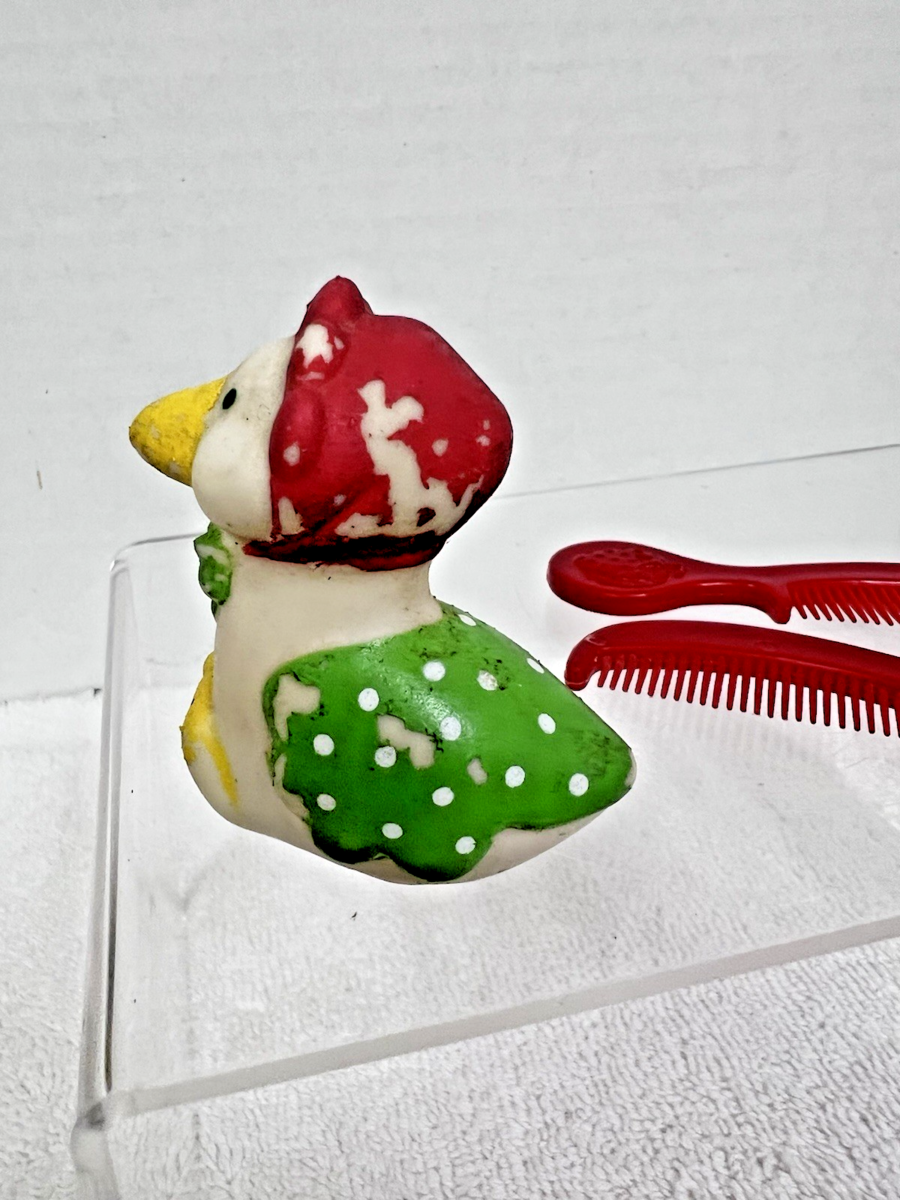 Vintage Miniature Strawberry Shortcake Rubber Duckie Figure and Red Strawberry Comb. Miniature white green yellow rubber duck figurine is marked on bottom AGC 1982 and measures approx. 2 1/4" tall, some wear to coloring, overall good used condition. Small red plastic strawberry on handle comb measures approx. 2 3/4" long and is in very good condition, teeth in comb intact good shape, no bend to comb. See pictures.