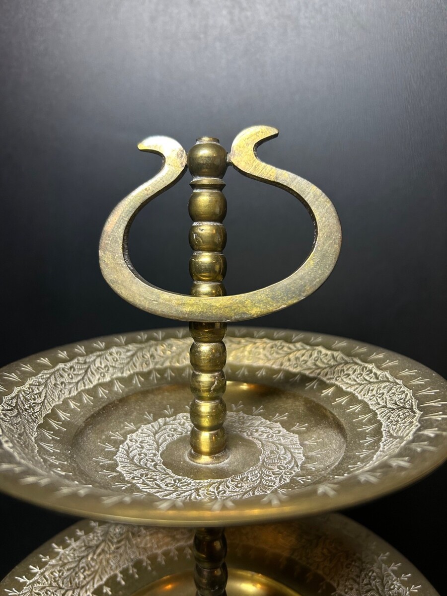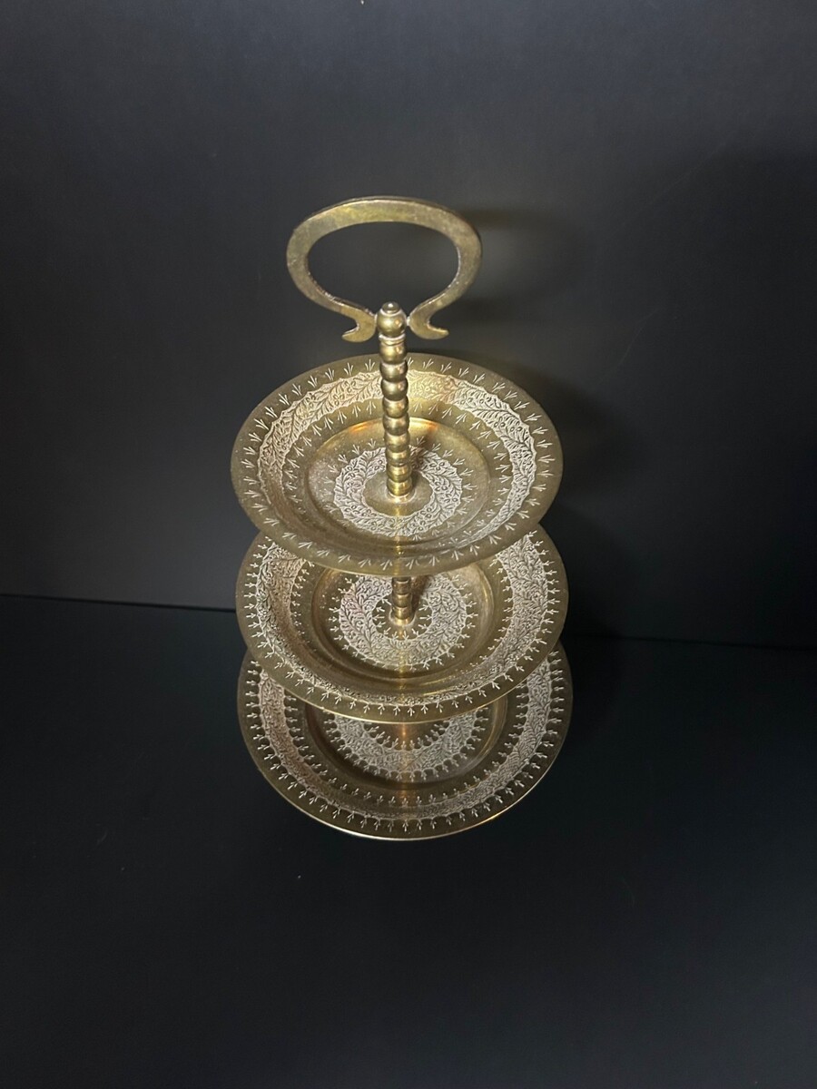 This timeless solid brass 3-tier serving dish showcases exquisite Indian craftsmanship. Its hand-etched design and tiered structure exude vintage sophistication and functionality.
