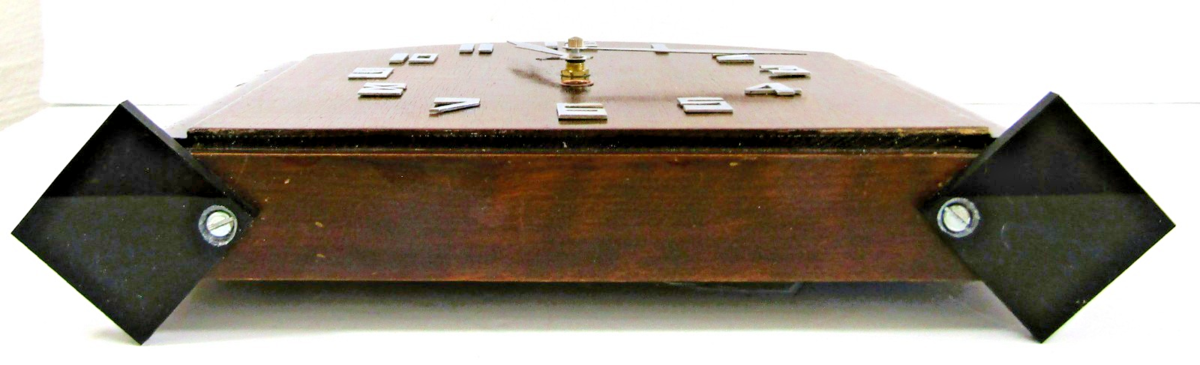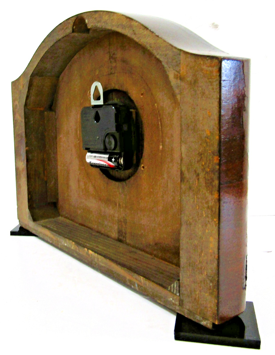 Converted to quartz. Chrome hands and numbers. Wood fginish is in good condition. Walnut wood. The clock was a wall clock, feet were added to make it a shelf clock.