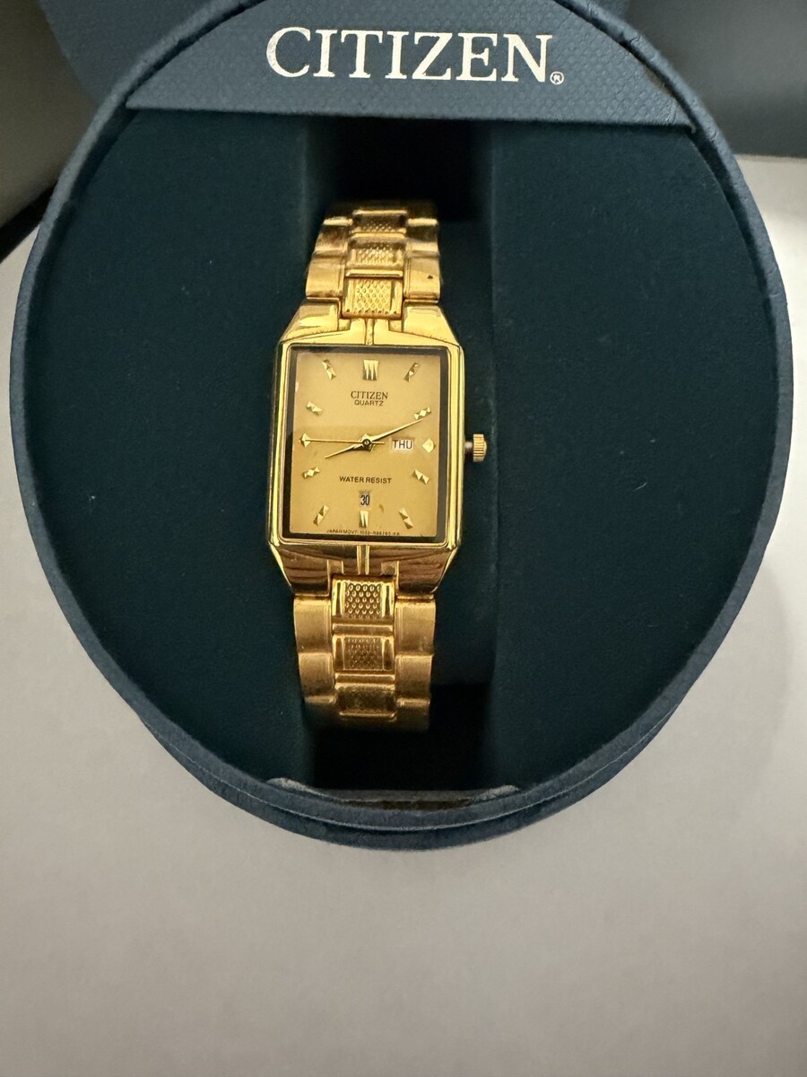 The Citizen Mens Gold-Tone Quartz Day/Date Wristwatch is a stylish and elegant timepiece crafted with a gold-tone stainless steel bracelet and case. Featuring a reliable quartz movement, this watch showcases a classic analog display with day/date features. Packaged in its original box, this wristwatch by Citizen is perfect for men seeking a sophisticated accessory with both style and functionality.