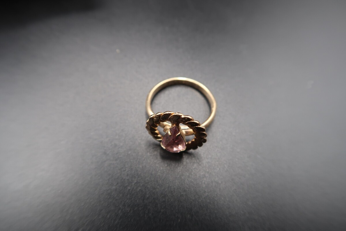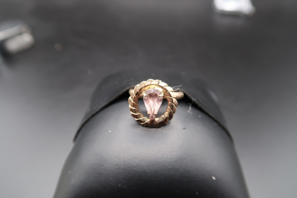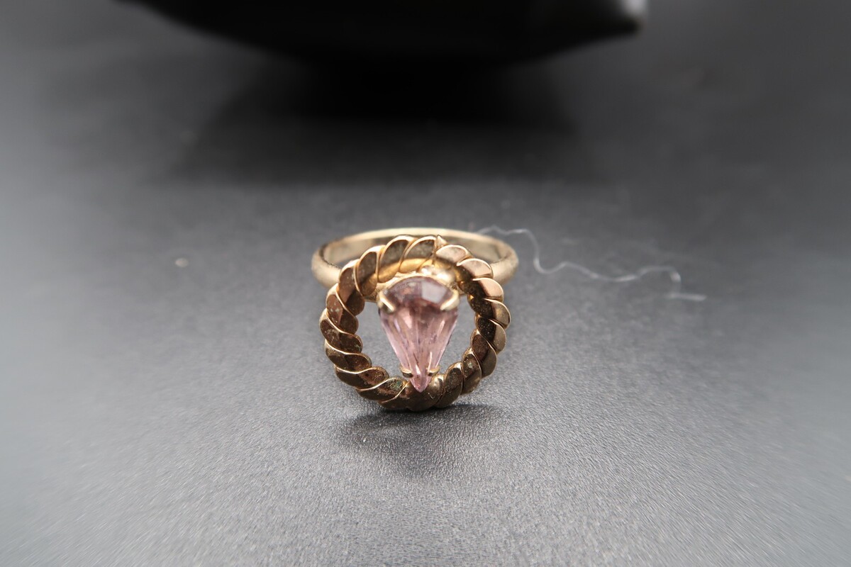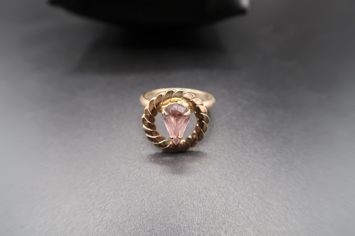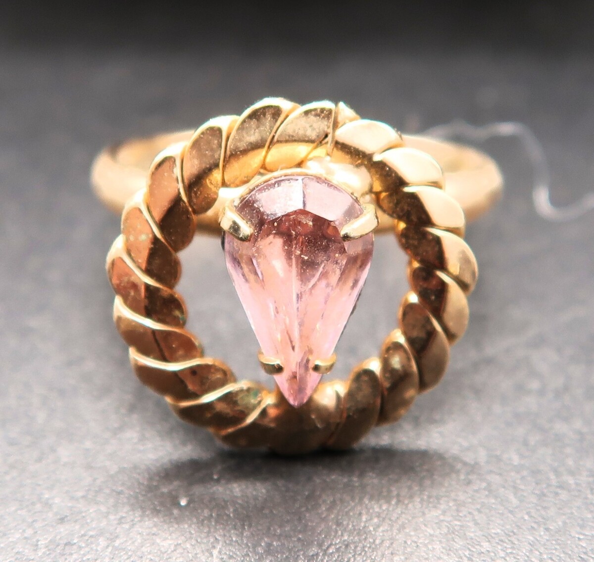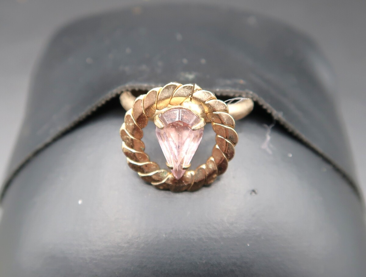 Vtg Gold Tone Adjustable Ring Pear Shape Prong Set Light Pink Rhinestone