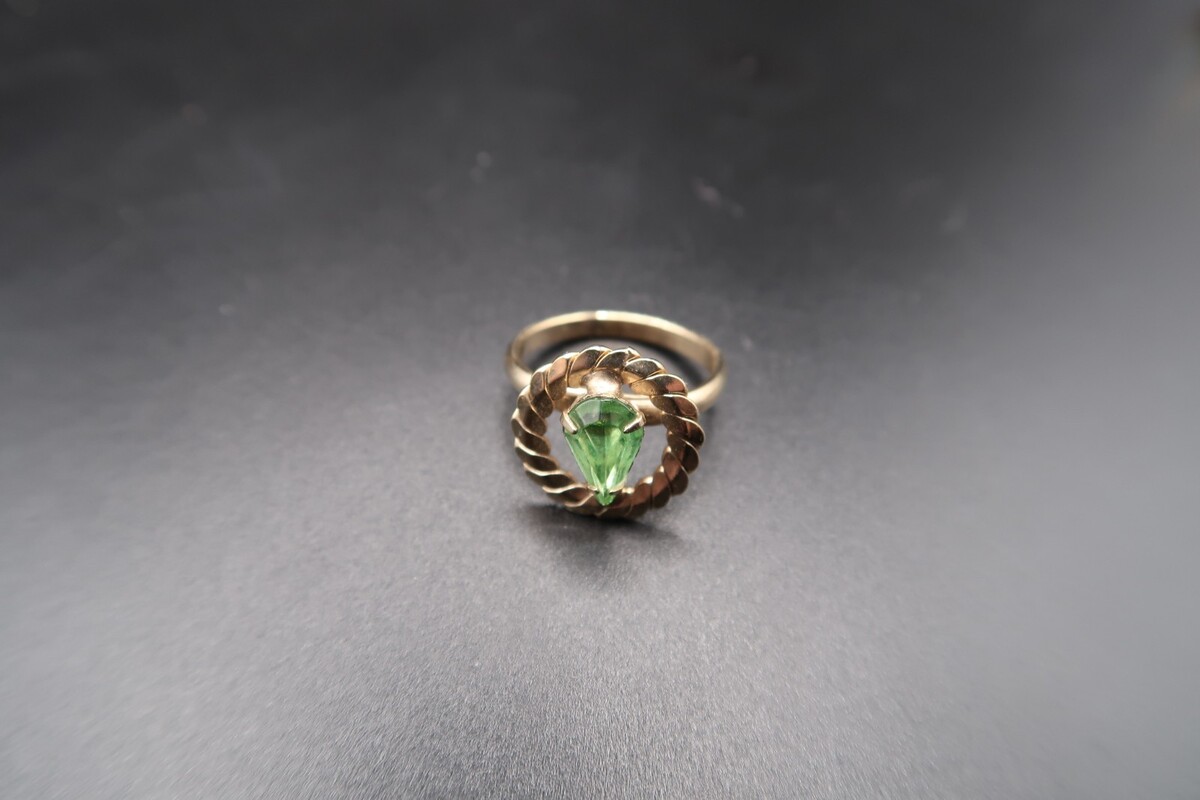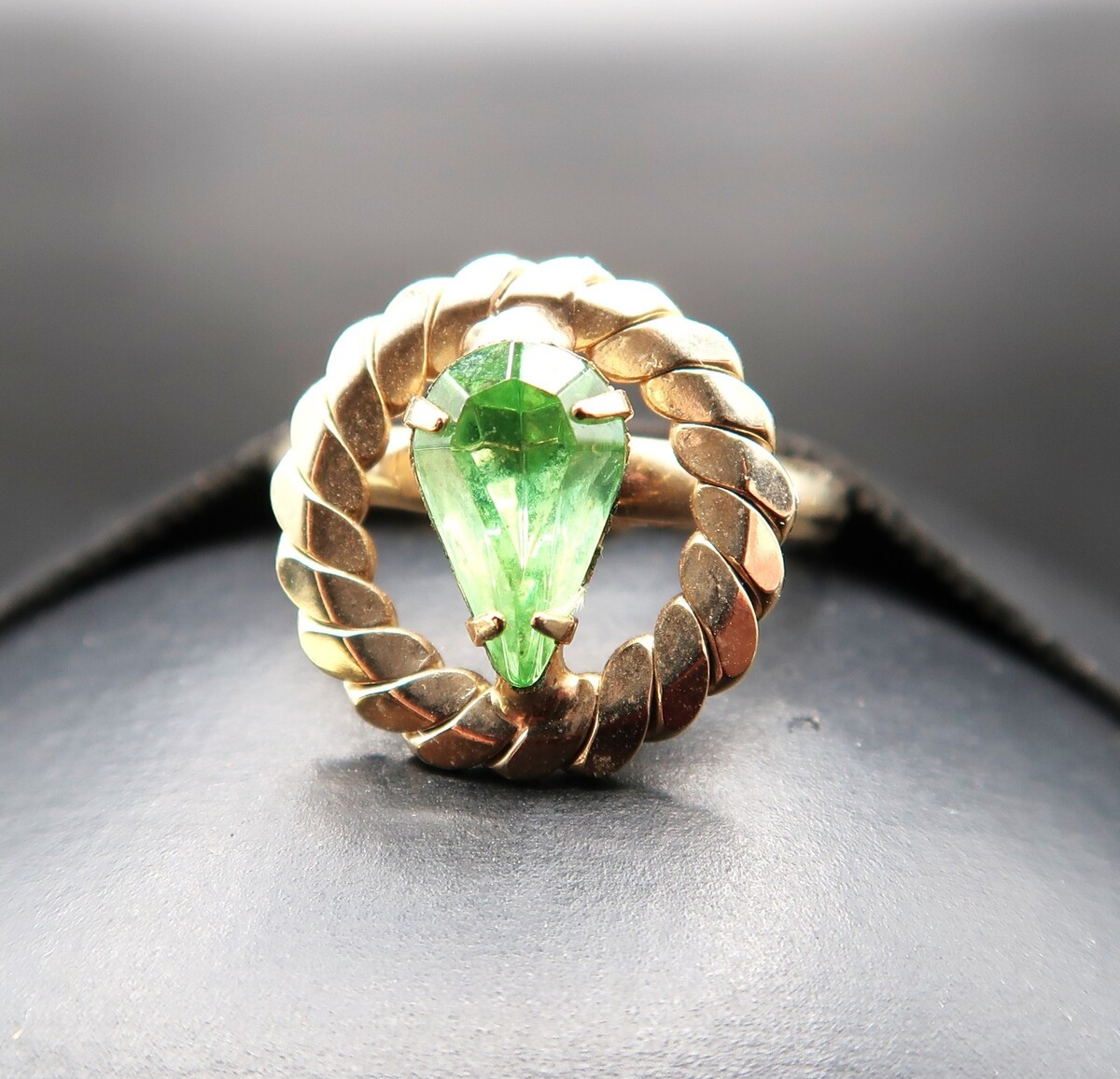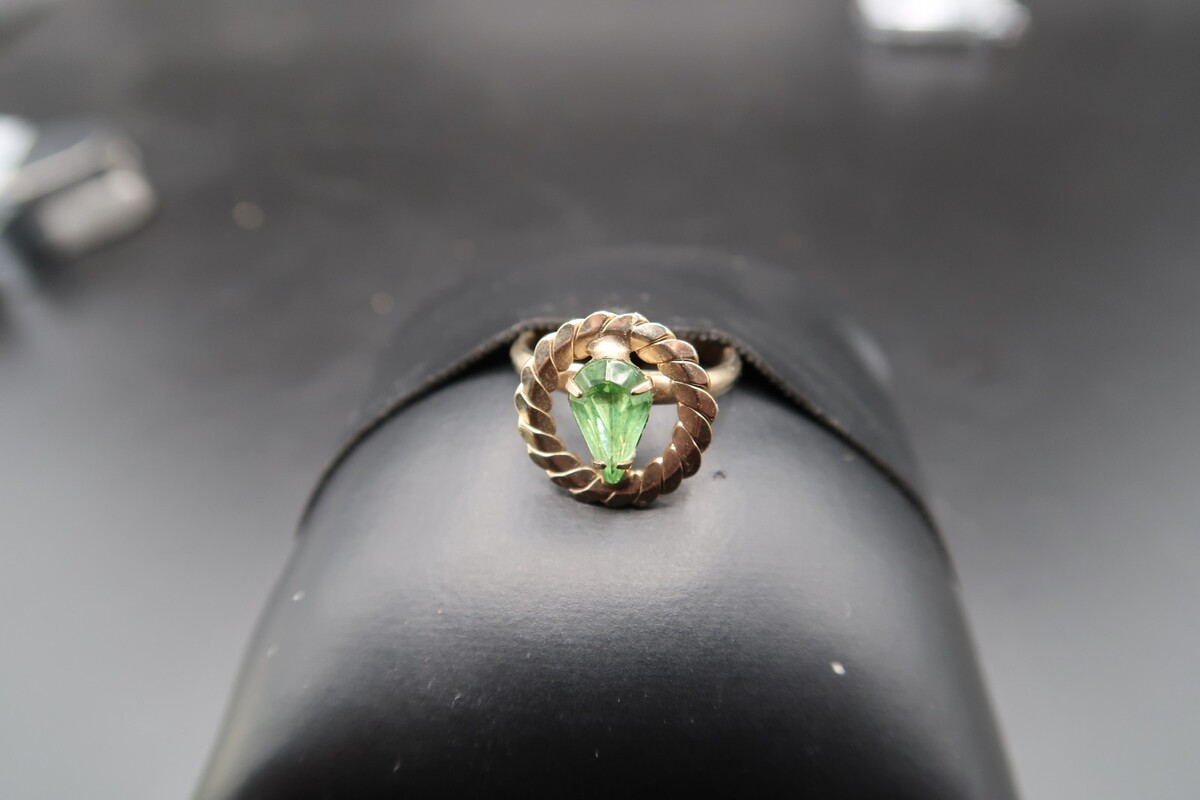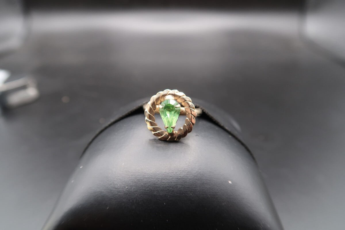 Vtg Gold Tone Adjustable Ring Pear Shape Prong Set Light Spring Green Rhinestone