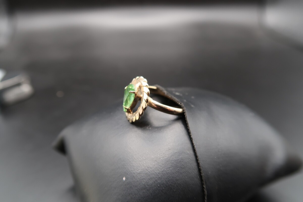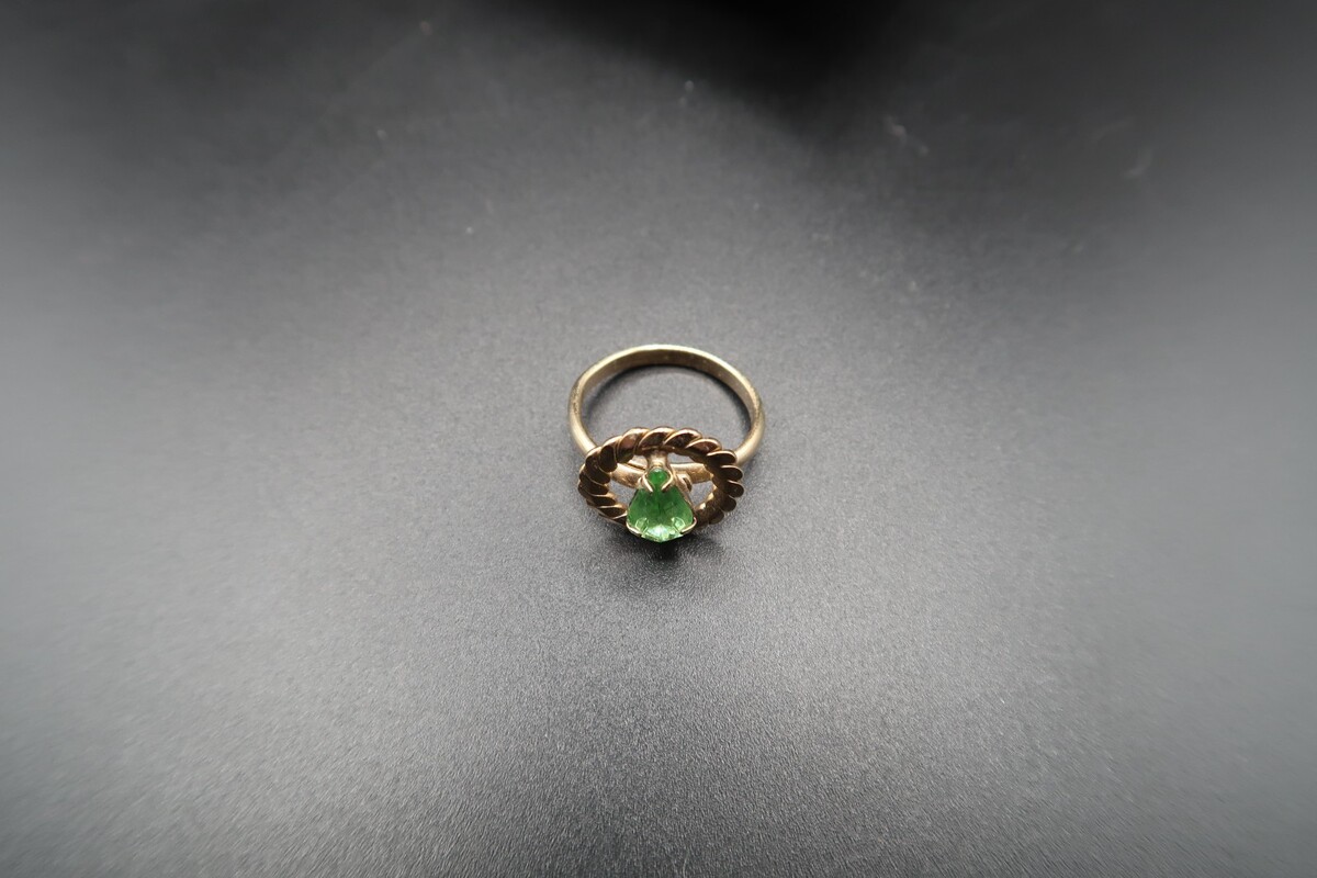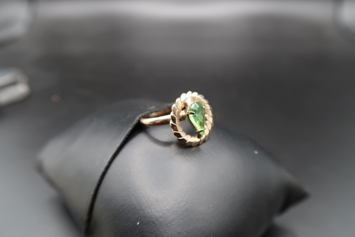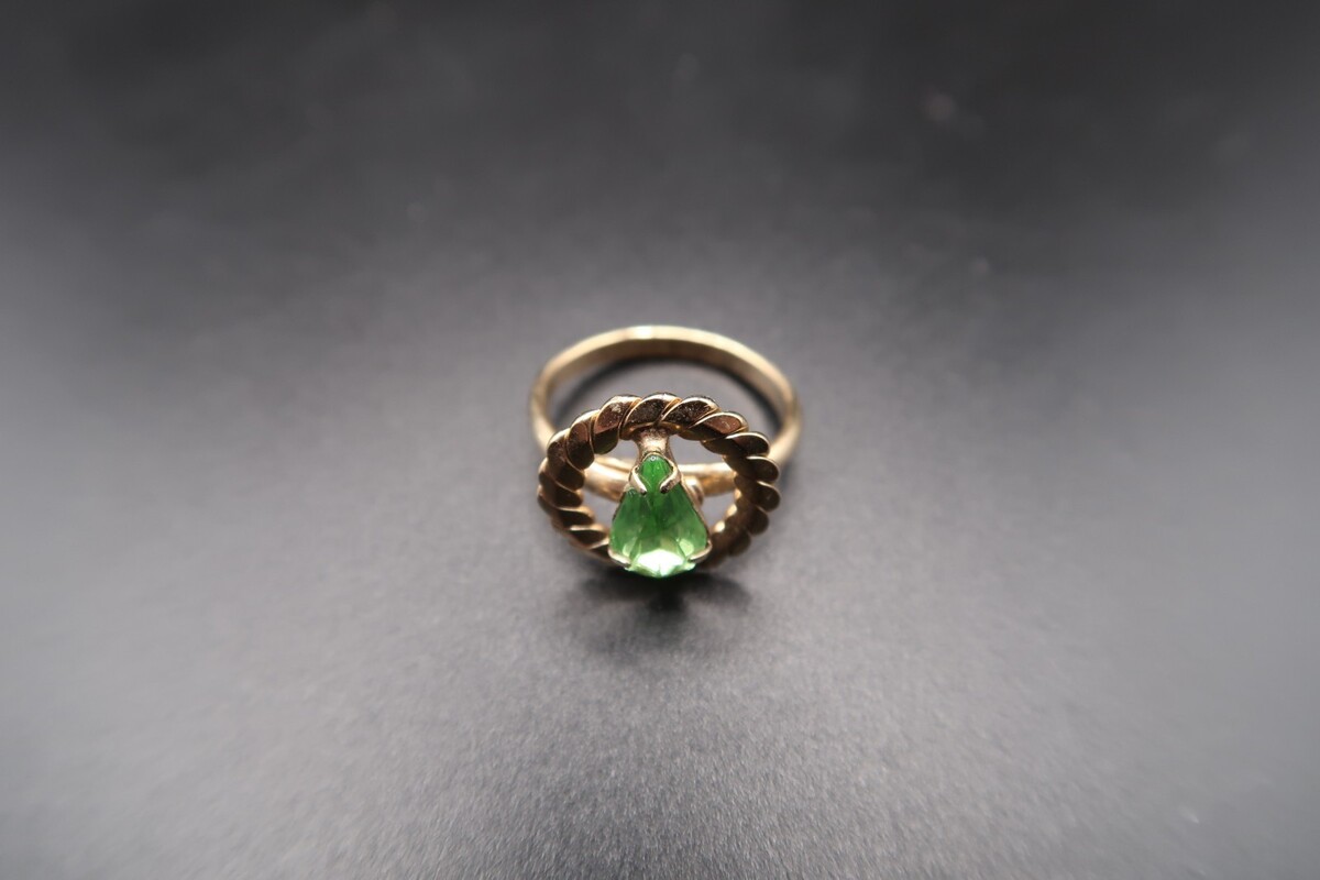 Vtg Gold Tone Adjustable Ring Pear Shape Prong Set Light Spring Green Rhinestone
