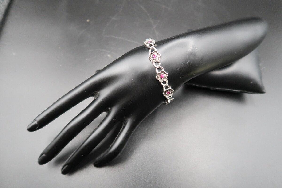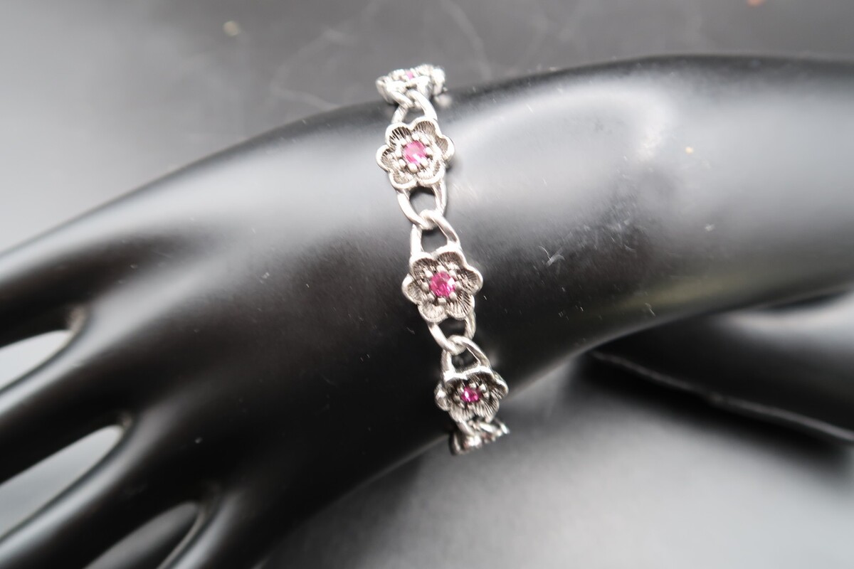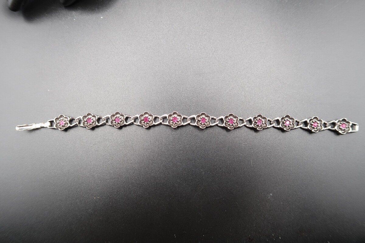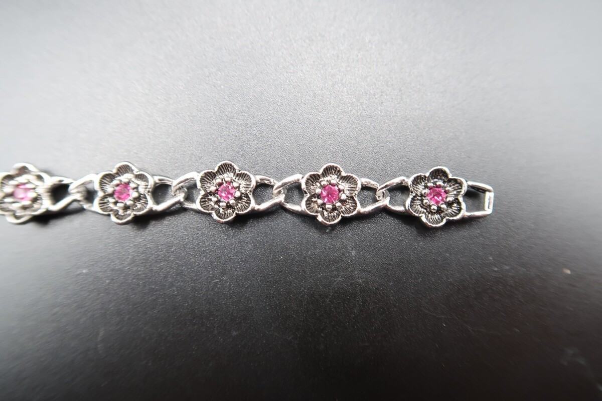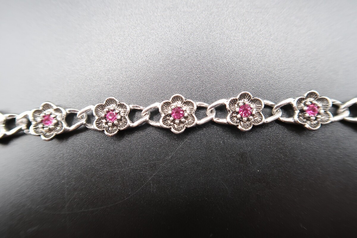Vtg Avon Silver Tone Flower Link Bracelet w/ Fuchsia Rhinestones