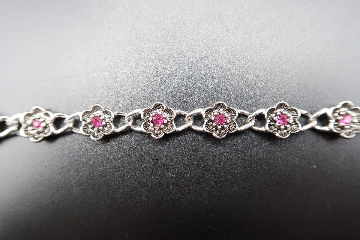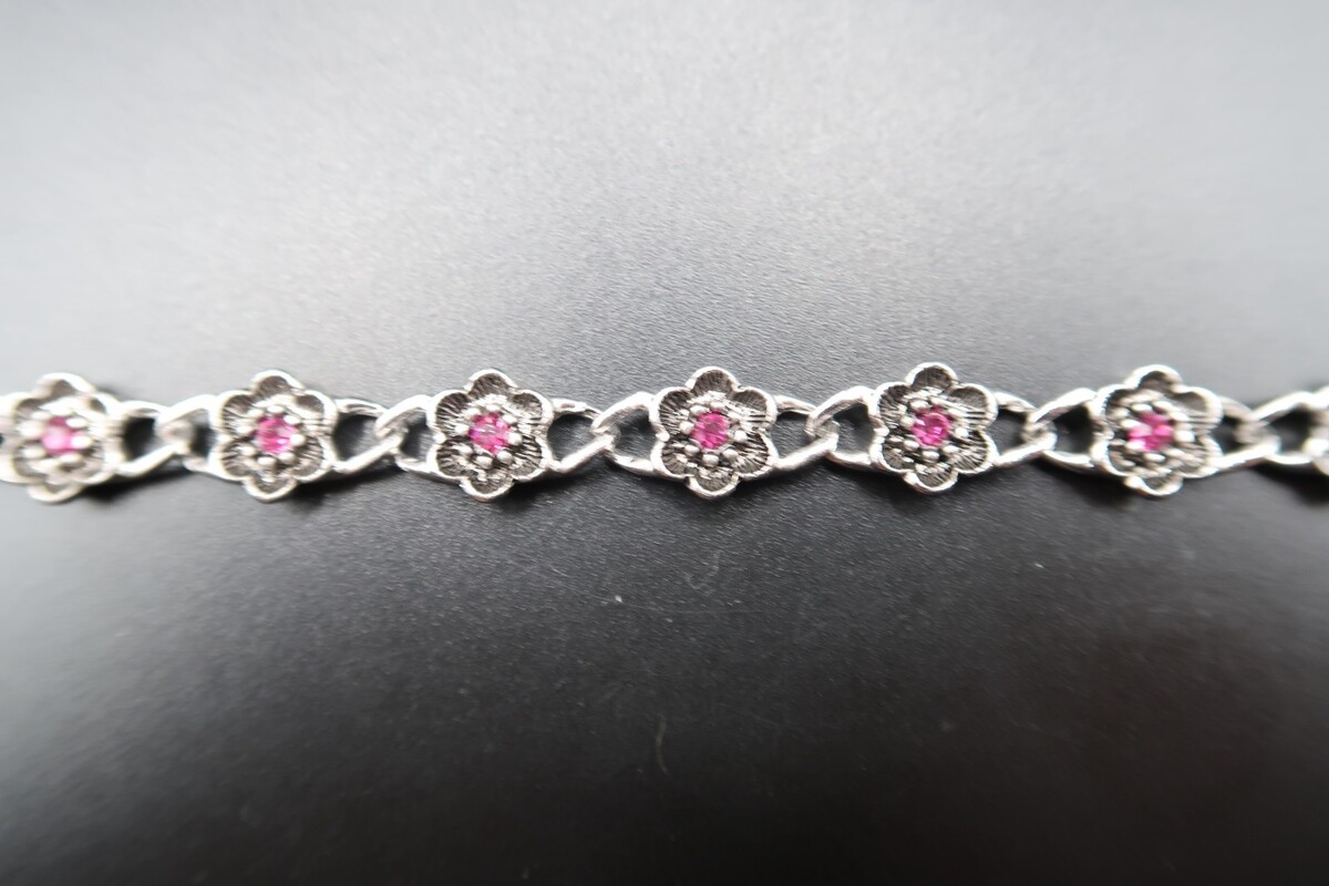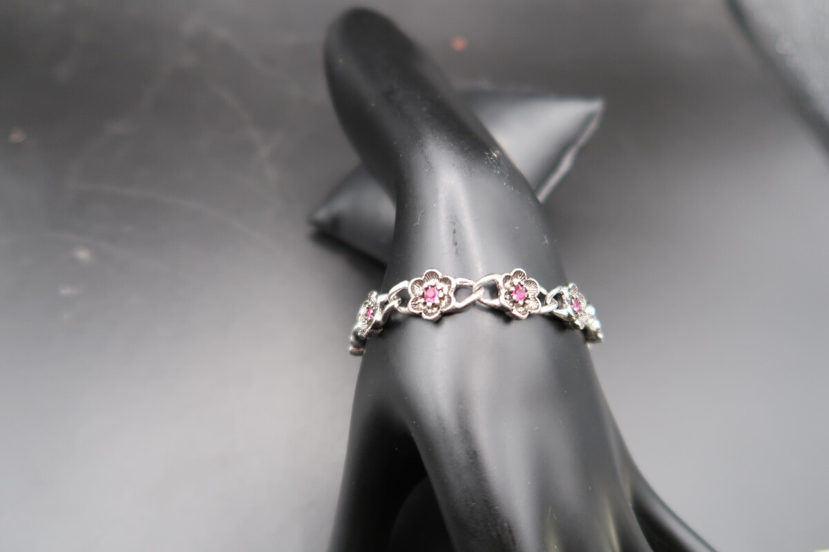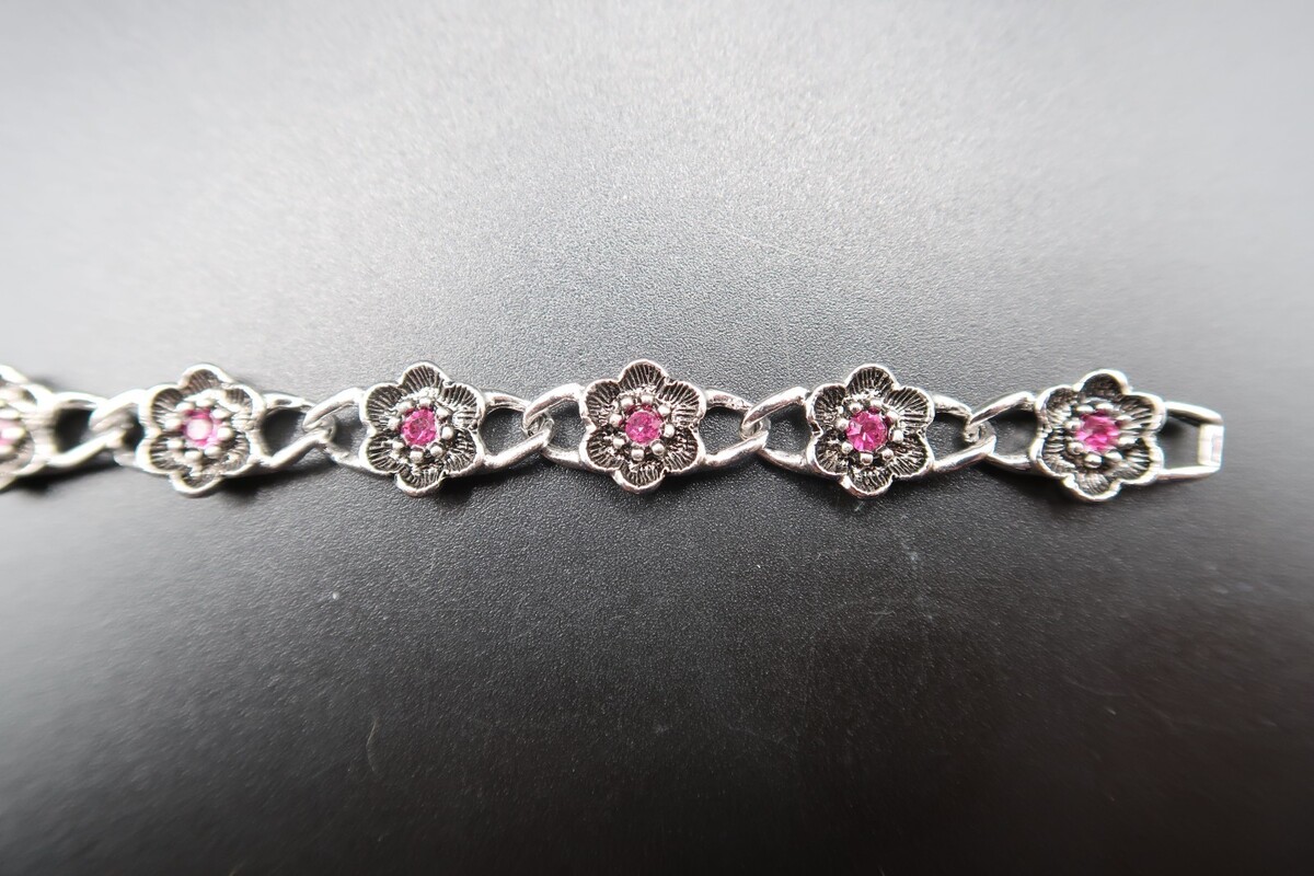 Vtg Avon Silver Tone Flower Link Bracelet w/ Fuchsia Rhinestones