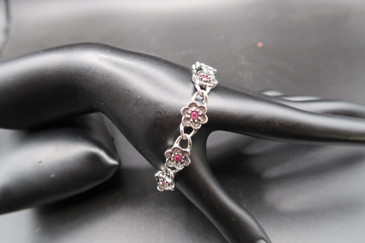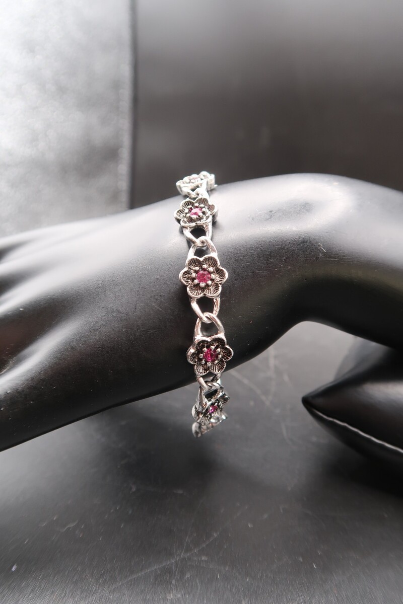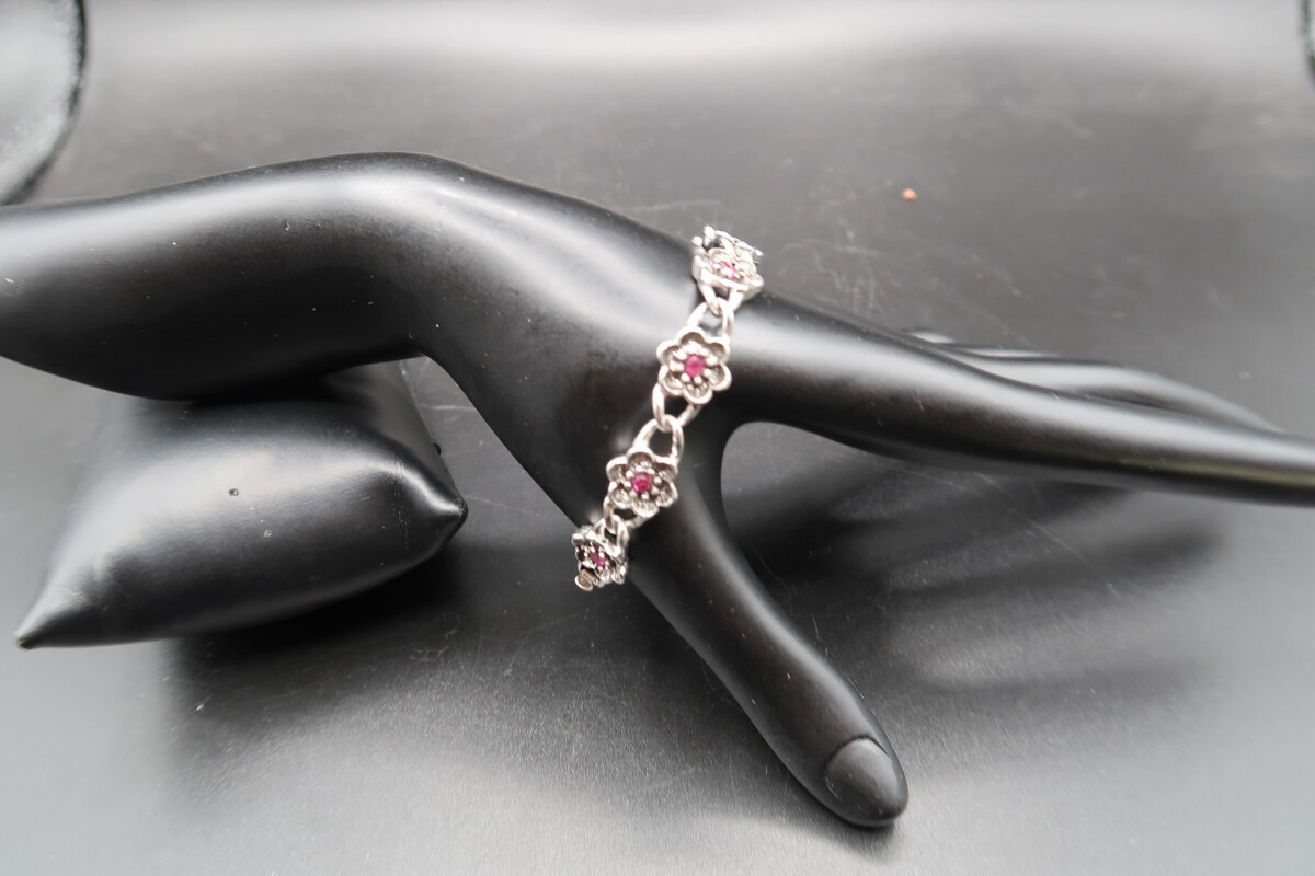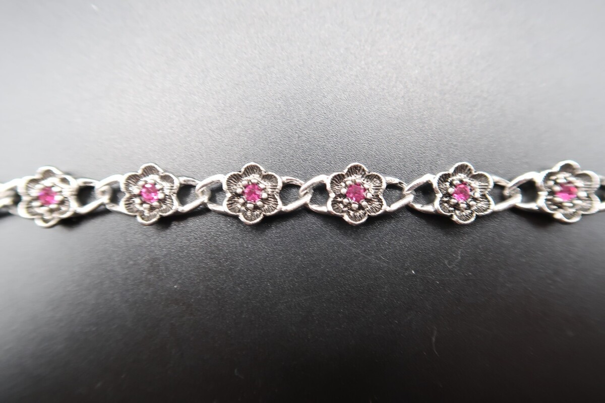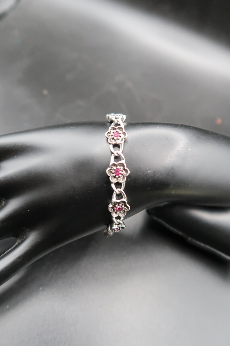 Vtg Avon Silver Tone Flower Link Bracelet w/ Fuchsia Rhinestones